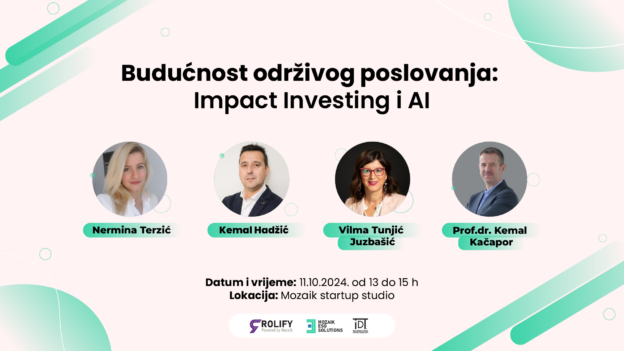 A kako poseban dodatak na ovu konferenciju, dana 11. oktobra u Mozaik startup studiju organiziramo [PANEL DISKUSIJA] Impact Investing i AI: Ključne inovacije za ESG. Ovo je jedinstvena prilika da saznaš više o impact investingu i o ulozi tehnologija budućnosti, posebno AI-a, u implementaciji ESG strategija i postizanju društveno-odgovornih ciljeva, kao i da se povežeš sa sjajnim panelistima: