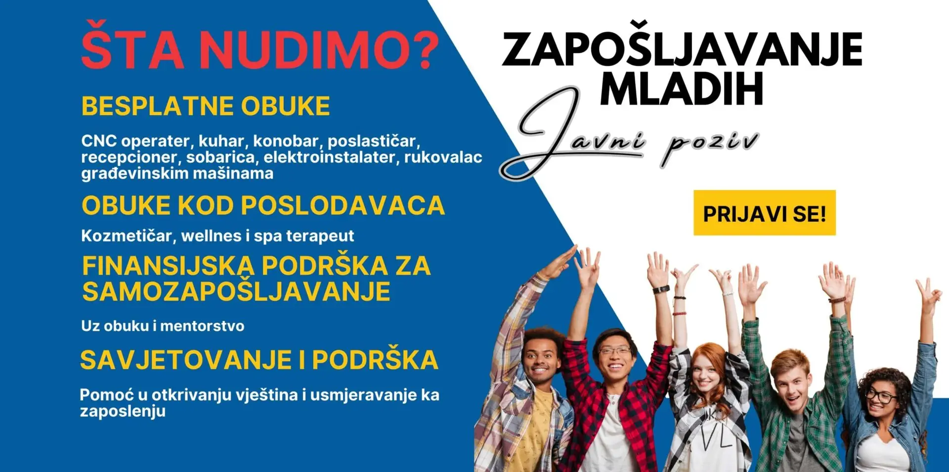 Projekat CINS4YOUTH nudi mladima od 15 do 29 godina u Kantonu Sarajevo priliku za besplatne obuke, zaposlenje kod poslodavca ili podršku za pokretanje vlastitog biznisa. Prijave su otvorene do popune mjesta. Projekt CIN4YOUTH se implementira u okviru inicijative “EUzaZapošljavanje”, uz finansijsku podršku Evropske unije i Švedske, i provodi ga Međunarodna organizacija rada (MOR). Cilj je unaprijediti programe aktivacije, savjetovanja, obuke i podrške za (samo)zapošljavanje mladih u Kantonu Sarajevo.