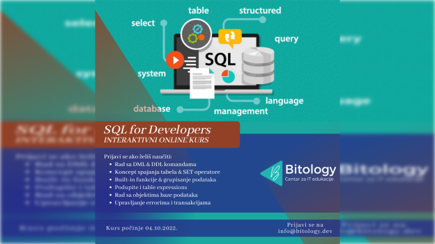 Kurs je namijenjen svima koji se u svakodnevnom radu susreću sa bazama podataka. Tokom kursa na interaktivan i dinamičan pristup primijeniti ćemo različite koncepte SQL-a za upite na bazi podataka, incijalno kroz osnovne SELECT upite, pa finalno do kreiranja kompleksne transkacione logike.