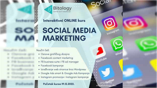 Na četvrtoj sezoni kursa “Social media marketing – Postani menadžer društvenih mreža” imate mogućnost da na interaktivan i dinamičan pristup primijenite i pokažete znanje digitalnog marketinga, kroz 5 modula raspoređeno u 15 interaktivnih predavanja sa 60+ praktičnih zadataka i 30+ samostalnih zadataka za polaznike.