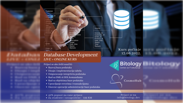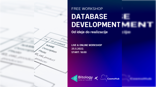 Centar za IT edukacije Bitology & CosmoHub Coworking, Event & Startup space organizuje besplatan workshop “Database Development – Od ideje do realizacije“, na kojem ćemo razgovarati o konceptu razvoja baza podataka, odnosno kako na osnovu zahtjeva klijenta dizajnirati bazu podataka. Upoznat ćemo Vas sa kreiranjem tabela i relacija između tabela baze podataka, kao i sa konceptima osiguravanja integritet podataka.