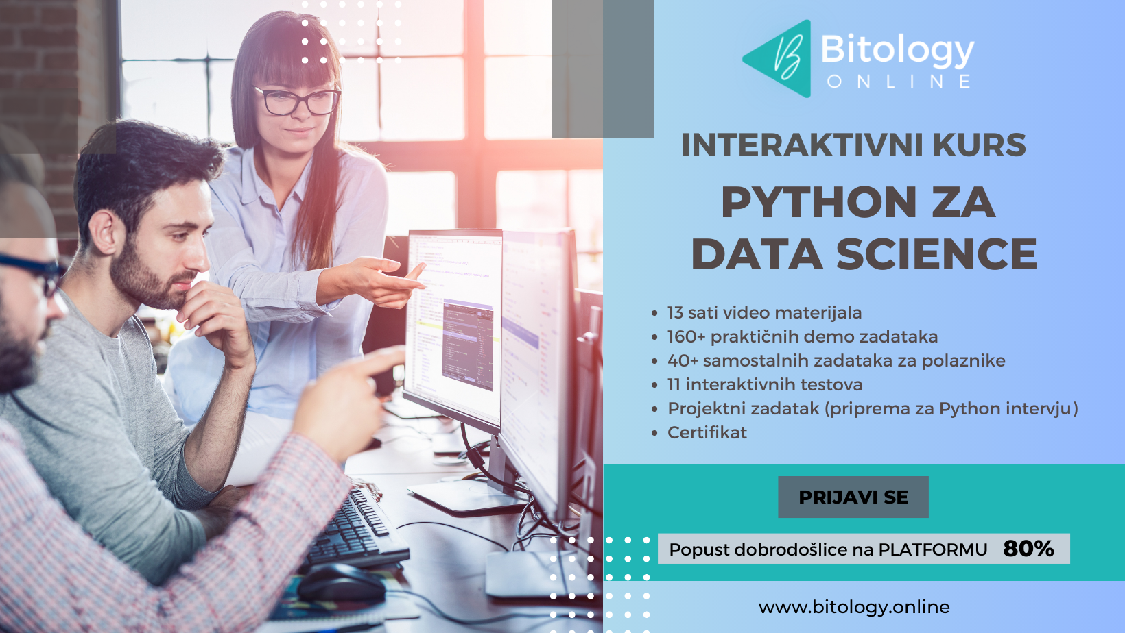 Interaktivni ONLINE kurs “Python za Data Science” vodi te od početnika do eksperta, gdje kroz praktično znanje, vježbe i zadatke stičeš cijenjene i dobro plaćene vještine najpopularnijeg i najtraženijeg programskog jezika današnjice.