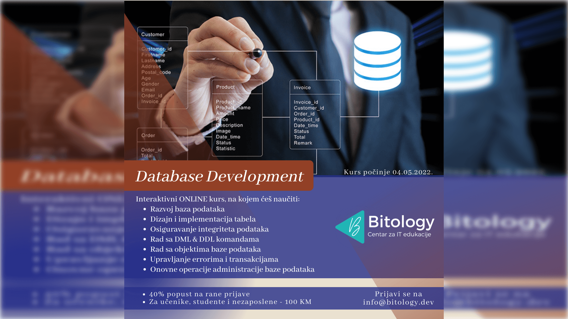 Ukoliko želiš da naučiš kako da razviješ bazu podataka na osnovu zahtjeva klijenta, kako da tu bazu napuniš testnim podacima, kako da manipulišeš sa podacima, te kako da radiš administraciju baze podataka, ovaj kurs je za tebe.