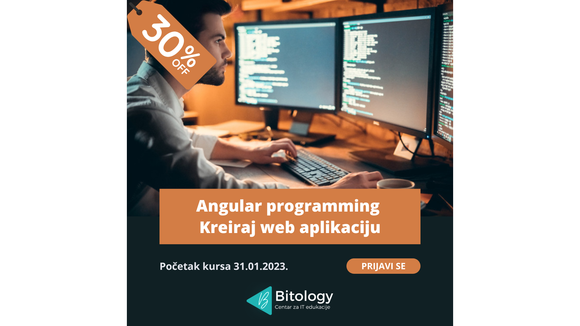 Na kursu „Angular Programming – Kreiraj web aplikaciju“, uz kontinuiran praktični rad, naučiti ćemo arhitekturu, alate i strukturu platforme Angular kompanije Google, za razvoj dinamičkih web aplikacija.