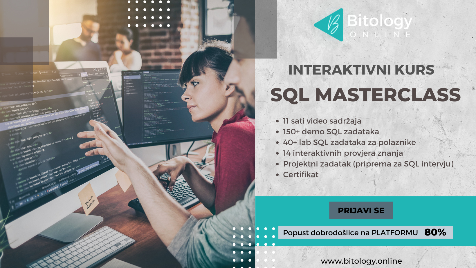 NOVO iz Bitology – Kurs SQL Masterclass od sada Vam je dostupan na našoj ONLINE platformi. Ako želite sami da definište intenzitet i vrijeme učenja, na pravom ste mjestu.