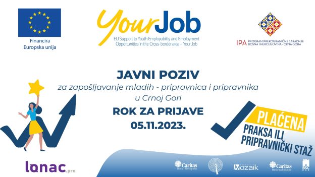 U okviru projekta Your Job, kojeg financira Europska unija, Caritas Bosne i Hercegovine, u partnerstvu s Udruženjem za razvoj kompetencija „S.K.I.L.L.S.“, Fondacijom Biznis start centar Bar, Caritasom Barske nadbiskupije i Fondacijom Mozaik, pokrenuo je program zapošljavanja pripravnika iz programskog prekograničnog područja BiH-CG[1] u trajanju od 5 mjeseci. Na javni poziv za poslodavce se prijavio ukupno 121 poslodavac, a stručno Povjerenstvo sastavljeno od članova projektnog tima i stručnog osoblja partnerskih organizacija odabralo je 27 (minimalno po 15 u BiH i 12 u Crnoj Gori) prijava poslodavaca sukladno navedenim kriterijima u pozivu. Kroz prethodni poziv je već zaposleno 22 pripravnika, a popis trenutnih dostupnih radnih mjesta za mlade pripravnike se nalazi u nastavku.