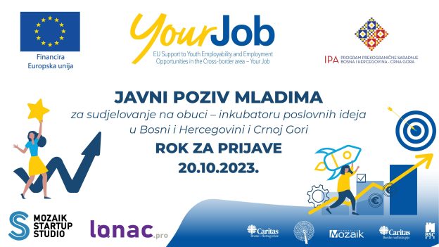 Caritas Bosne i Hercegovine i Socijalno-edukativni centar, u partnerstvu s Impakt Fondacijom, u okviru projekta Potpora zapošljivosti i mogućnostima zapošljavanja mladih – Your Job, a koji se provodi u okviru projekta EUzaZapošljavanje uz podršku Europske unije i Švedske, i kojeg realizira Međunarodna organizacija rada u BiH, poziva sve zainteresirane nezaposlene mlade u dobi od 18-29 godina da se prijave za sudjelovanje na obuci Inkubator poslovnih ideja. Obuka podrazumijeva predavanja i mentorstvo o ključnim elementima poslovnog dizajna/modeliranja.