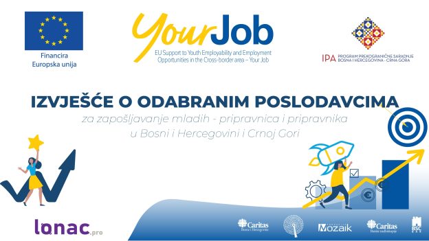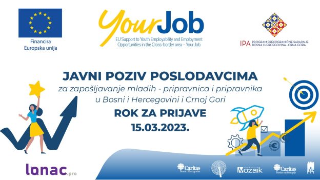 U okviru projekta Your Job, kojeg financira Europska unija, Caritas Bosne i Hercegovine, u partnerstvu s Udruženjem za razvoj kompetencija „S.K.I.L.L.S.“, Fondacijom Biznis start centar Bar, Caritasom Barske nadbiskupije i Fondacijom Mozaik, pokrenuo je program zapošljavanja pripravnika iz programskog prekograničnog područja BiH-CG u trajanju od 5 mjeseci.