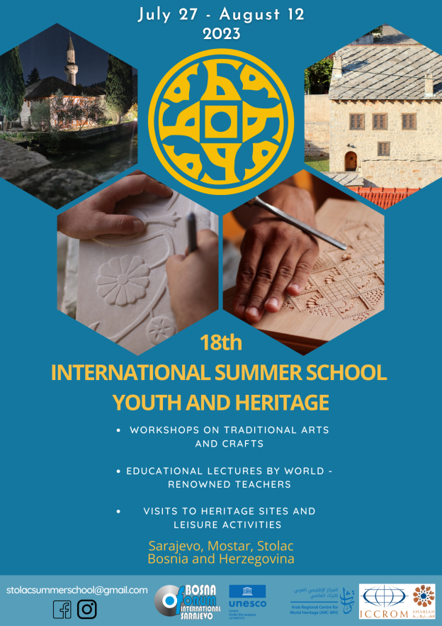 18. Međunarodna ljetna škola Mladi i naslijeđe održat će se od 27. jula do 12. augusta 2023. godine u Sarajevu, Mostaru i Stocu, Bosna i Hercegovina. Uvodna predavanja će se održati online u periodu od 22. do 24. juna 2023. godine.