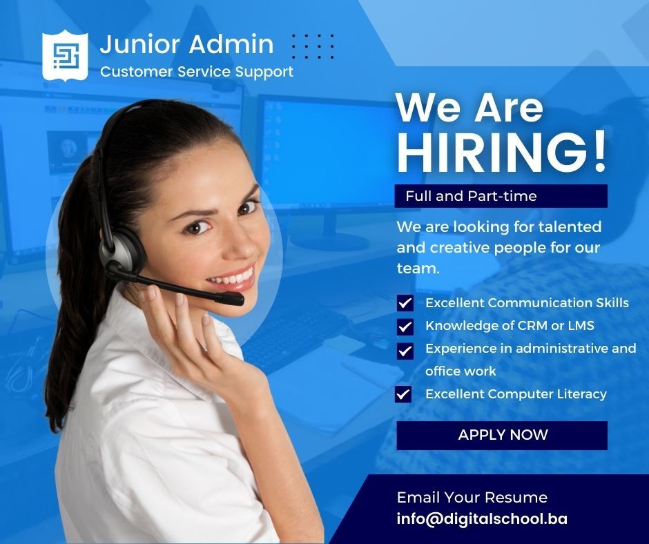 Idealan kanditat za Junior Admin Assistant poziciju može biti neko sa izrazito dobrim komunikacijskim i organizacionim vješinama. Poželjna su predhodna iskustva u podršci korisnicima.