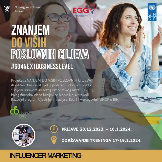 Projekat ZNANJEM DO VIŠIH POSLOVNIH CILJEVA #Go4NextBusinessLevel je podržan u okviru projekta “Boljom upravom do bržeg ekonomskog rasta” (EGG 2), kojeg finansira Vlada Kraljevine Norveške, a provodi Razvojni program Ujedinjenih nacija u Bosni i Hercegovini (UNDP u BiH).