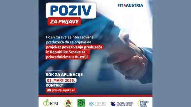 WIFI International (odjeljenje Privredne komore) iz Beča u saradnji sa Predstavništvom Republike Srpske u Austriji, Inovacionim centrom Banja Luka, Investiciono-razvojnom bankom Republike Srpske i Privrednom komorom Republike Srpske objavljuje poziv za sva zainteresovana preduzeća da se prijave na projekat povezivanja preduzeća iz Republike Srpske sa privrednicima u Austriji.