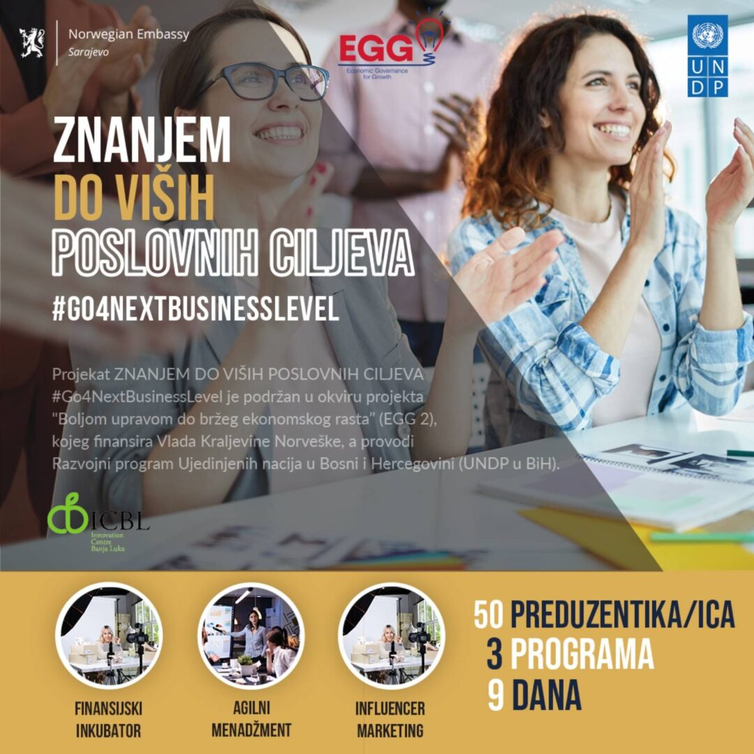 Inovacioni centar Banja Luka poziva mlade preduzetnice (18-45 godina) sa preduzećima mlađim od 5 godina da se prijave za obuku „INFLUENCER MARKETING ZA MLADE PREDUZETNICE“ u okviru projekta ZNANJEM DO VIŠIH POSLOVNIH CILJEVA #Go4NextBusinessLevel.