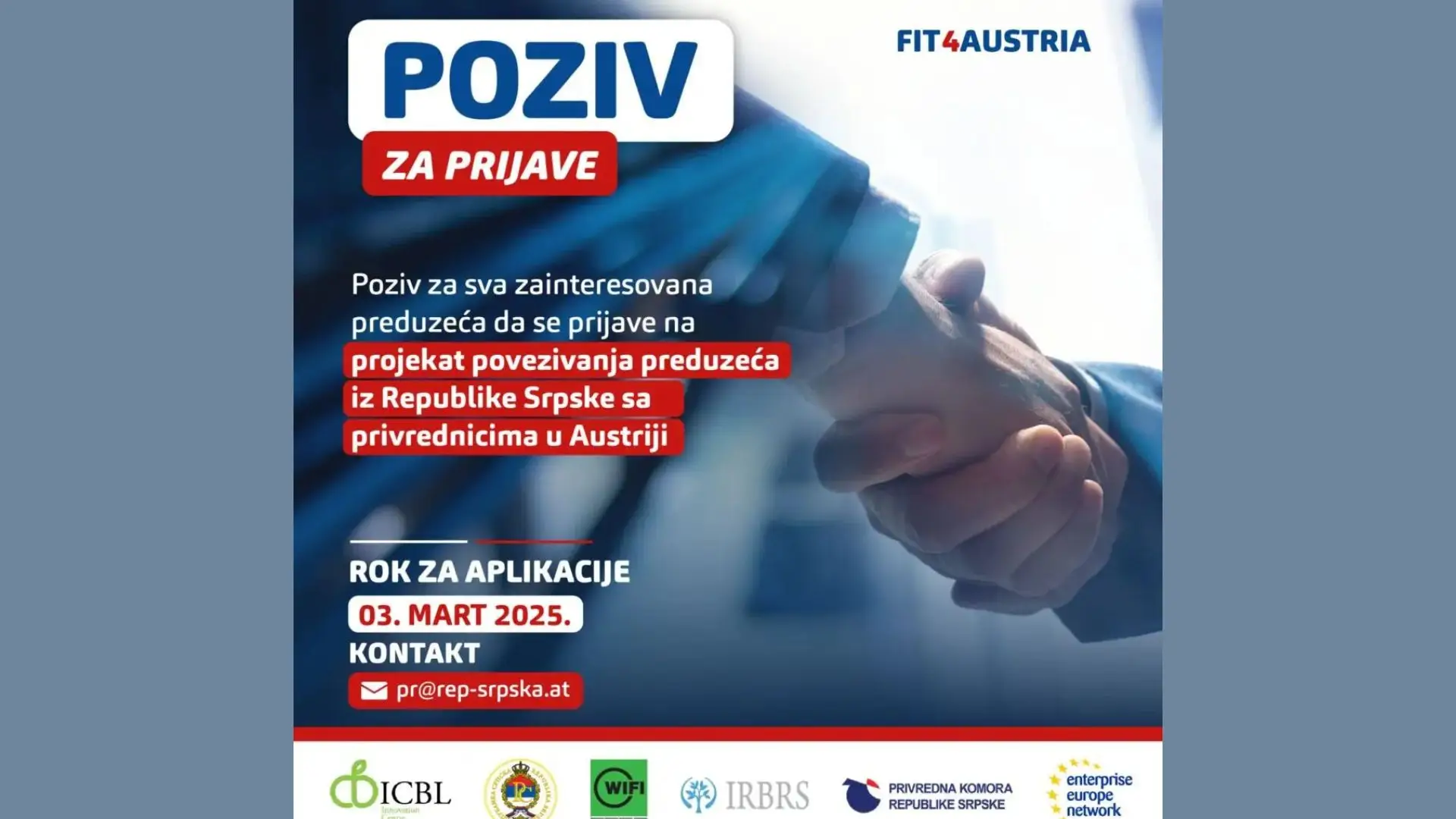 WIFI International (odjeljenje Privredne komore) iz Beča u saradnji sa Predstavništvom Republike Srpske u Austriji, Inovacionim centrom Banja Luka, Investiciono-razvojnom bankom Republike Srpske i Privrednom komorom Republike Srpske objavljuje poziv za sva zainteresovana preduzeća da se prijave na projekat povezivanja preduzeća iz Republike Srpske sa privrednicima u Austriji.