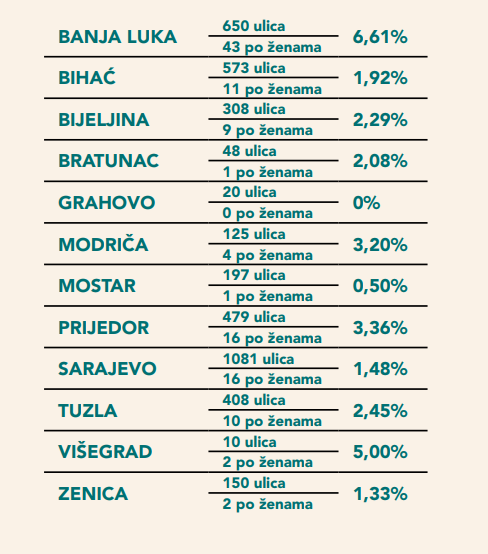 Kako izgleda statistička (ne)prisutnost žena u imenovanju bosanskohercegovačkih ulica, a samim time i nejednakost, možeš pogledati u nastavku: