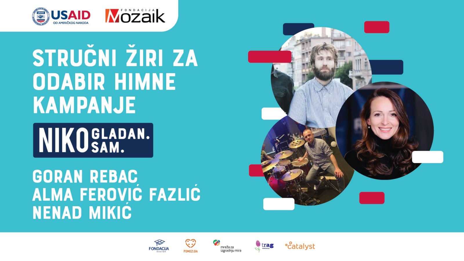 U sklopu kampanje #NikoGladanNikoSam, koja je dio projekta Pravni okvir za filantropiju koji provodi Fondacija Mozaik zajedno sa partnerskim organizacijama (Fondacija Hastor, Udruženje Pomozi.ba, Mreža za izgradnju mira, Fondacija Trag i Catalyst Balkans) uz finansijsku podršku USAID-a, održan je konkurs za himnu ove inicijative.