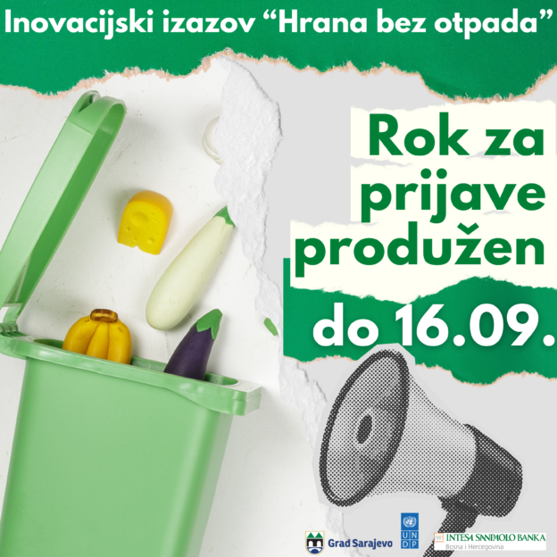 Grad Sarajevo, u partnerstvu s Razvojnim programom Ujedinjenih nacija (UNDP) i Intesa Sanpaolo Bankom, produžio je rok za prijavu inovativnih rješenja u okviru izazova „Hrana bez otpada“. Novi rok za prijave je 16. septembar 2024. godine.