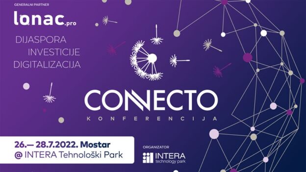 Konferencija Connecto 2022 održat će se u utorak, 26. 7. u dvorani Europa Tehnološkog Parka Intera u Mostaru u suradnji s lonac.pro. U okviru konferencije organiziraju se dva panela. Prvi će biti posvećen ulaganjima, odnosno investicijama u Bosnu i Hercegovinu, a drugi panel je posvećen digitalizaciji.