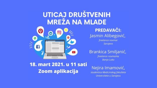 Pozivaju se studentice i studenti novinarstva da učestvuju u interaktivnoj online radionici na temu “Uticaj društvenih mreža na mlade” koja će se održati 18. marta 2021. godine s početkom u 11:00 sati putem Zoom aplikacije.
