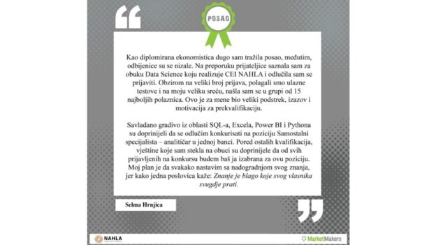 Pročitajte utiske i iskustvo Selme Hrnjice koja je pohađala obuku Junior Data Science u CEI NAHLA, a zatim dobila zaposlenje u bankarskom sektoru.