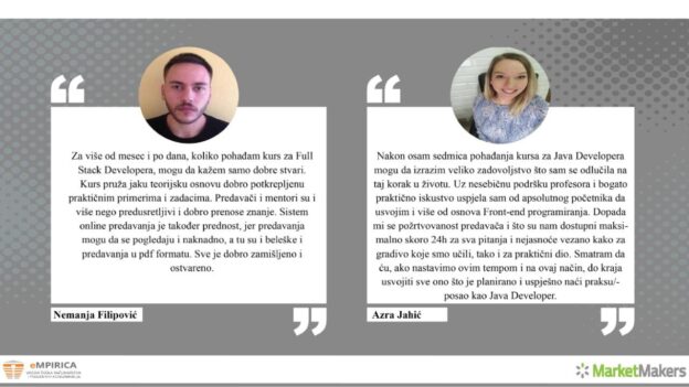 Pročitajte utiske i iskustva polaznika Visoke škole računarstva i poslovnih komunikacija eMPIRICA koja nudi edukaciju iz raznih programa (full-stack, front-end, back-end, web, JAVA, Microsoft, Android, iOS itd.) i interaktivnu i praktično orijentiranu nastavu preko web konferencijskog sistema, snimanje svih sesija i pristup snimcima, prezentacijama i praktičnim zadacima preko platforme za e-učenje, kontinuirano praćenje napretka kandidata, plaćanje po završetku programa i još mnogo toga.