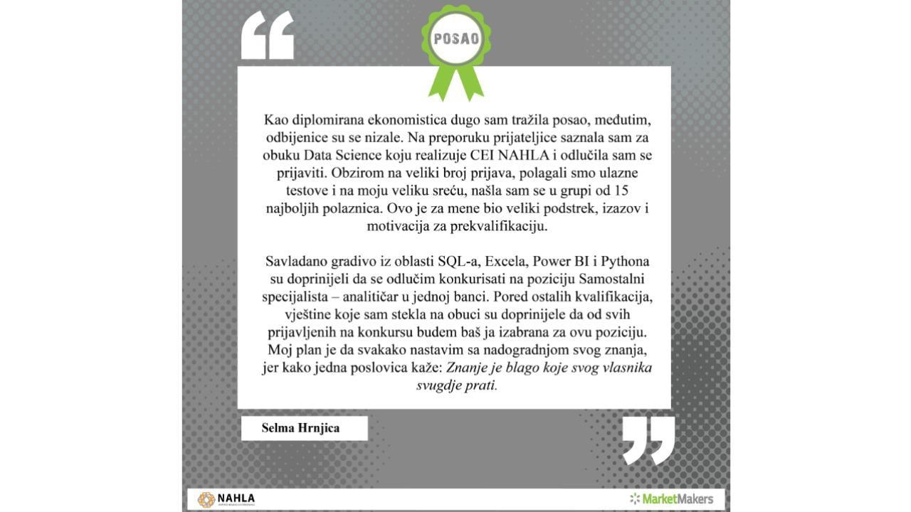 Pročitajte utiske i iskustvo Selme Hrnjice koja je pohađala obuku Junior Data Science u CEI NAHLA, a zatim dobila zaposlenje u bankarskom sektoru.