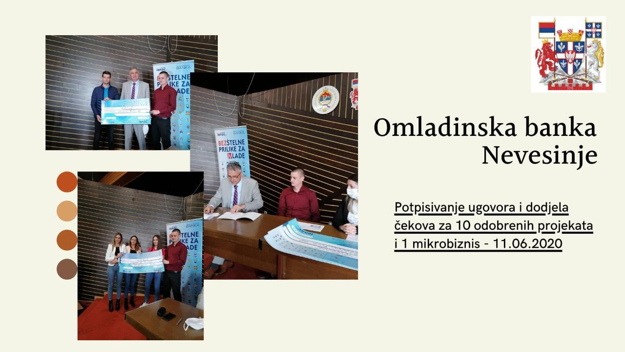 Ceremonija potpisivanja ugovora i dodjele čekova za projekte prvog poziva Omladinske banke Nevesinje.