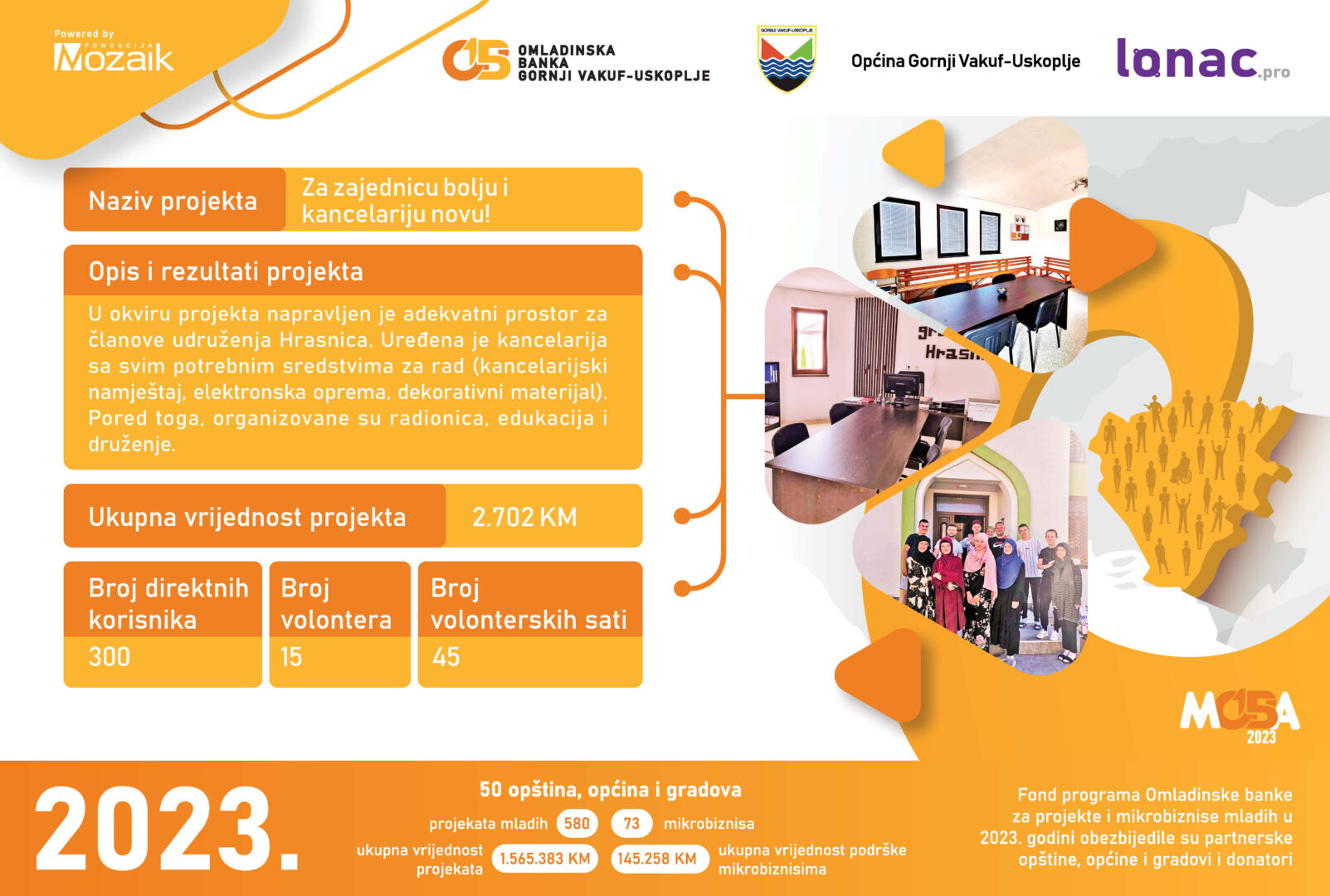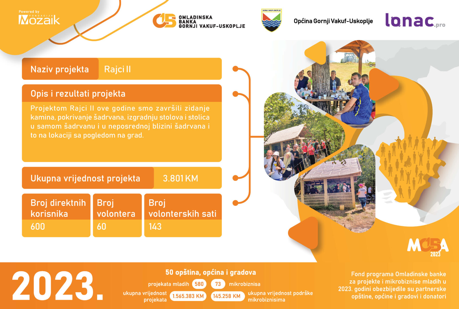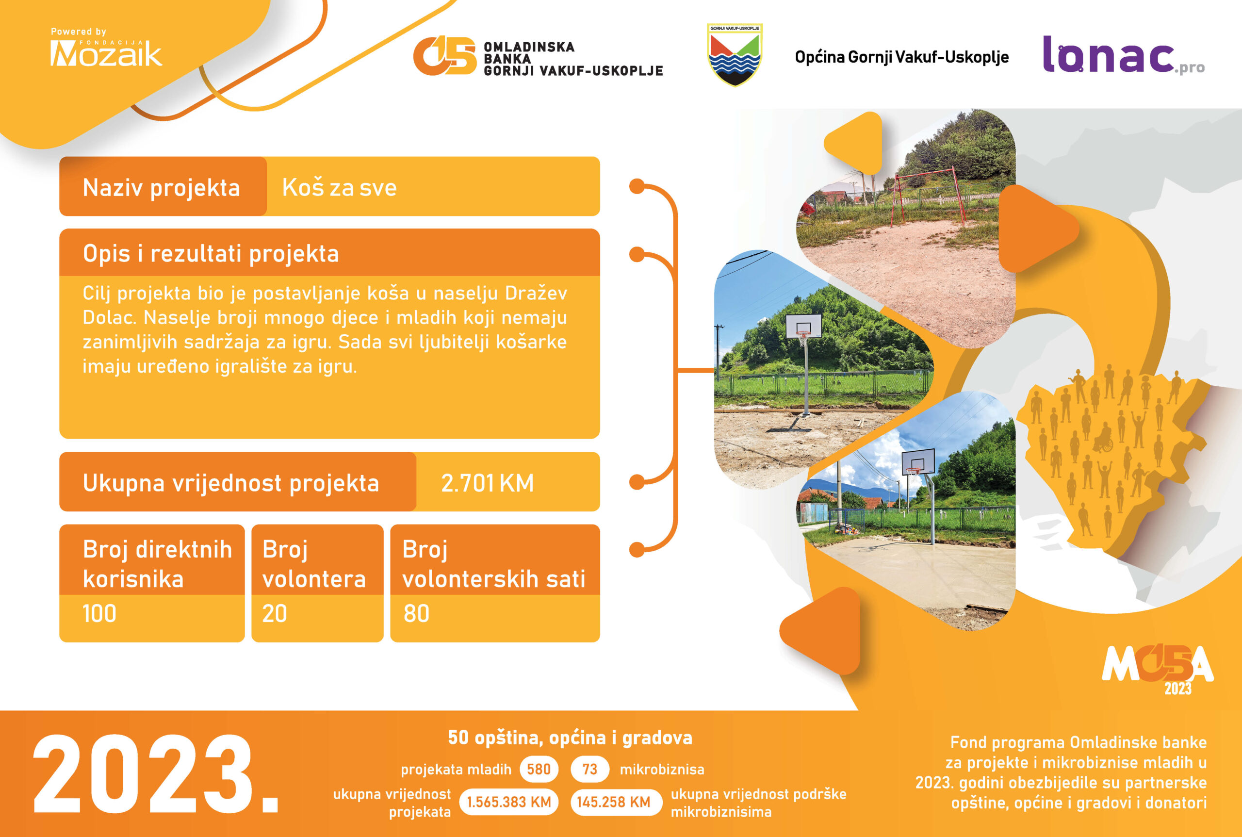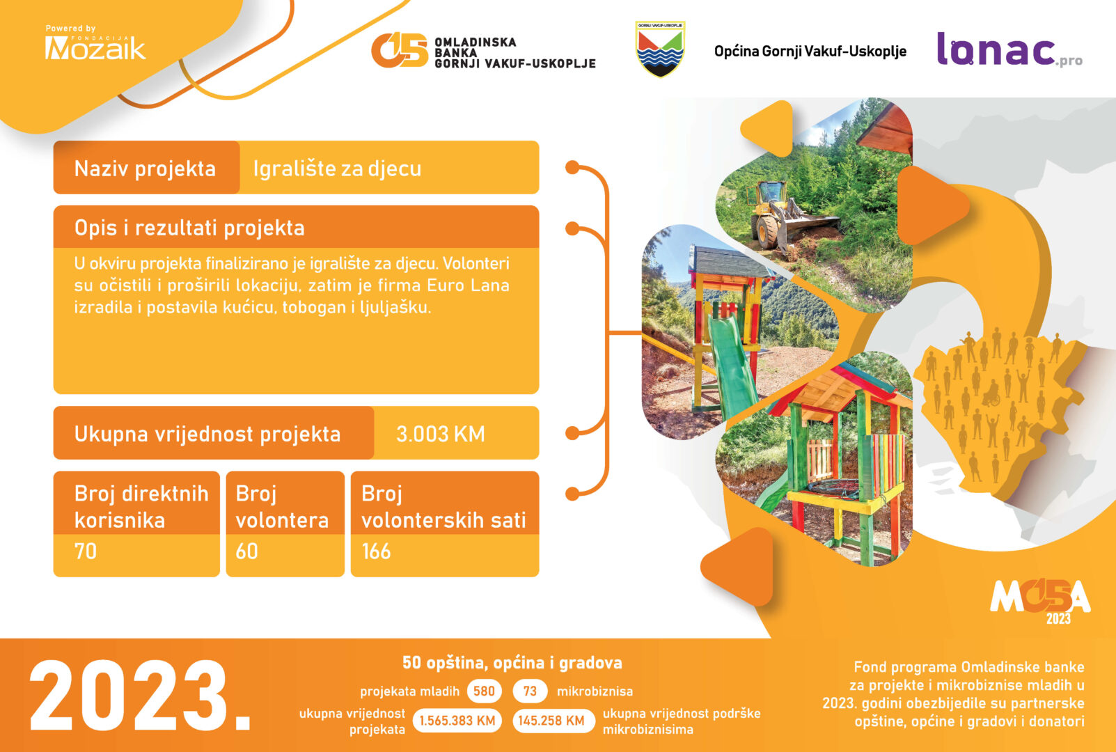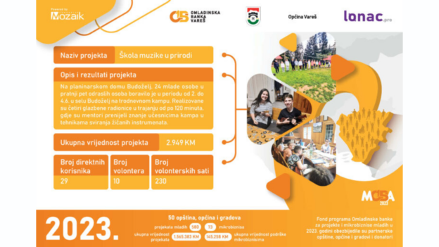 Tokom 2023. godine je realizovano 8 projekata ukupne vrijednosti 23,011 KM, od čega je Općina Gornji Vakuf-Uskoplje izdvijila 8,646 KM, a Fondacija Mozaik 5,764 KM. Doprinos zajednice u vidu robe, novca ili usluga za realizaciju 8 projekata je iznosio 8,600 KM.