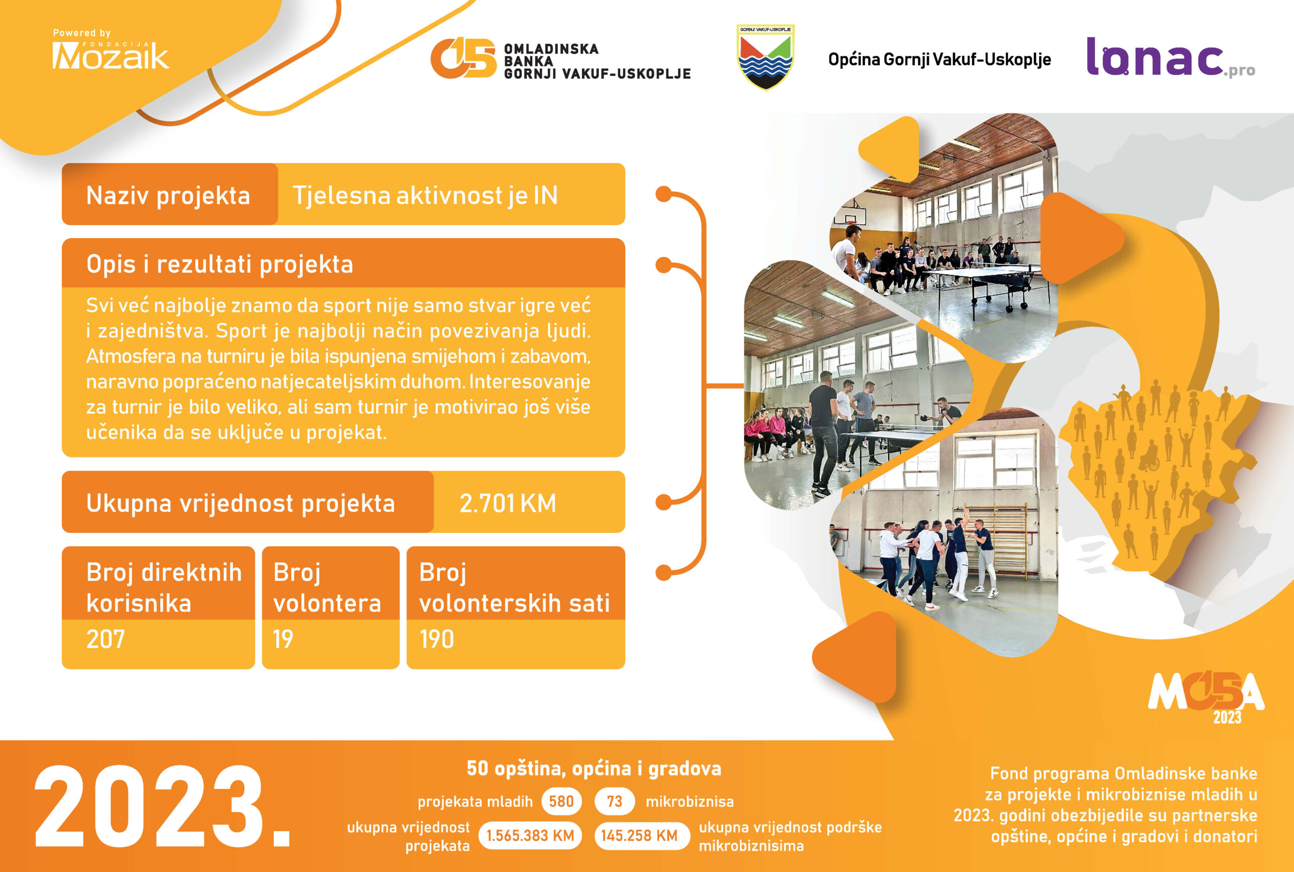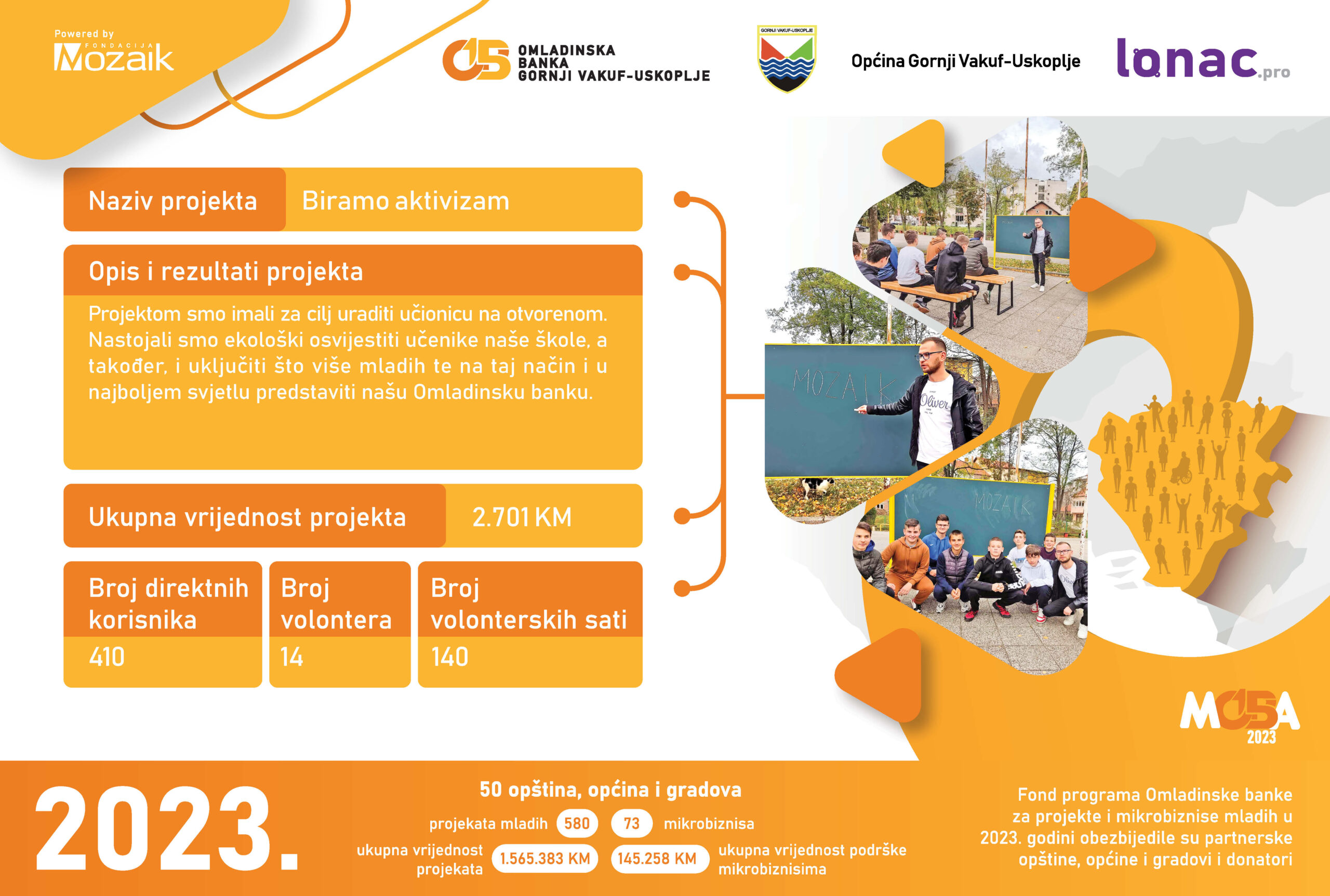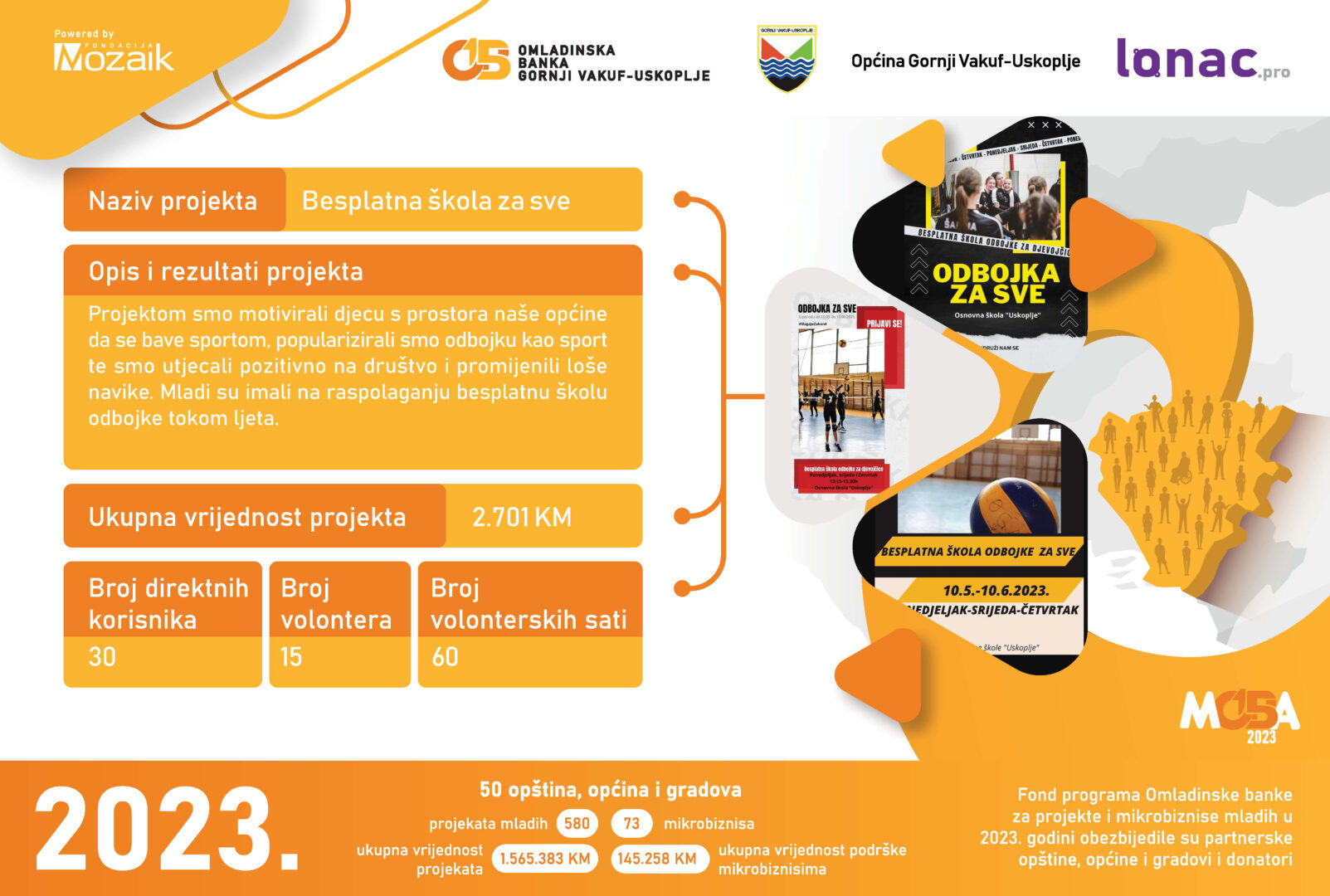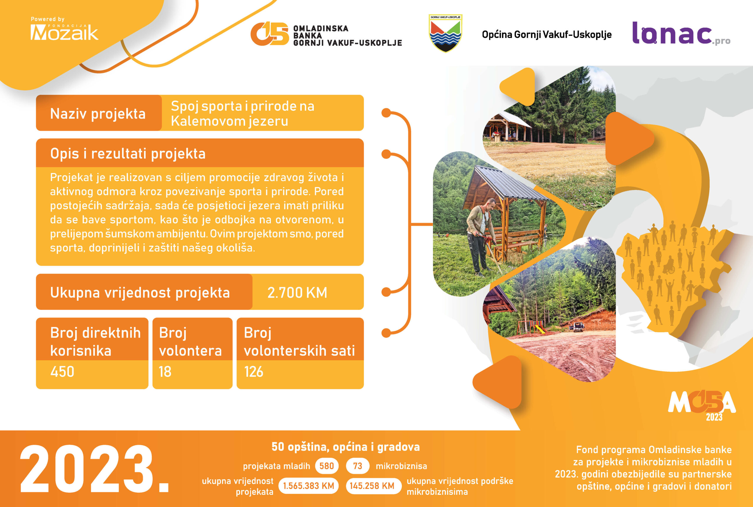 Tokom 2023. godine je realizovano 8 projekata ukupne vrijednosti 23,011 KM, od čega je Općina Gornji Vakuf-Uskoplje izdvijila 8,646 KM, a Fondacija Mozaik 5,764 KM. Doprinos zajednice u vidu robe, novca ili usluga za realizaciju 8 projekata je iznosio 8,600 KM.