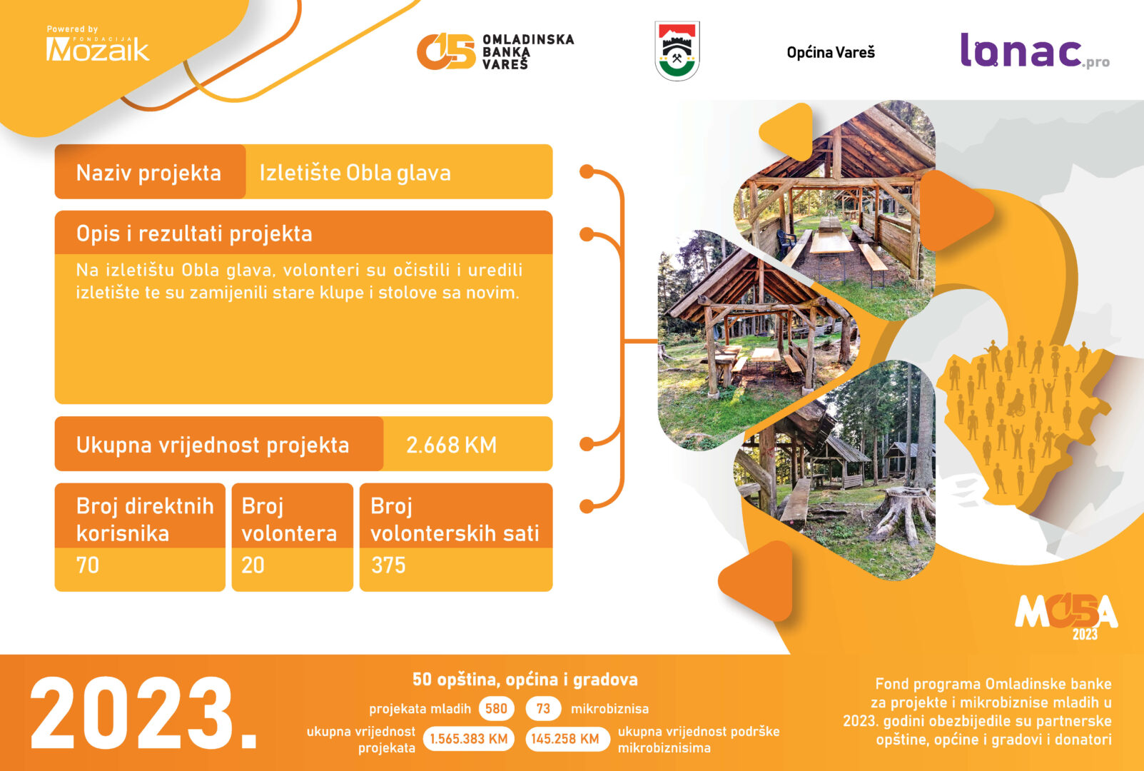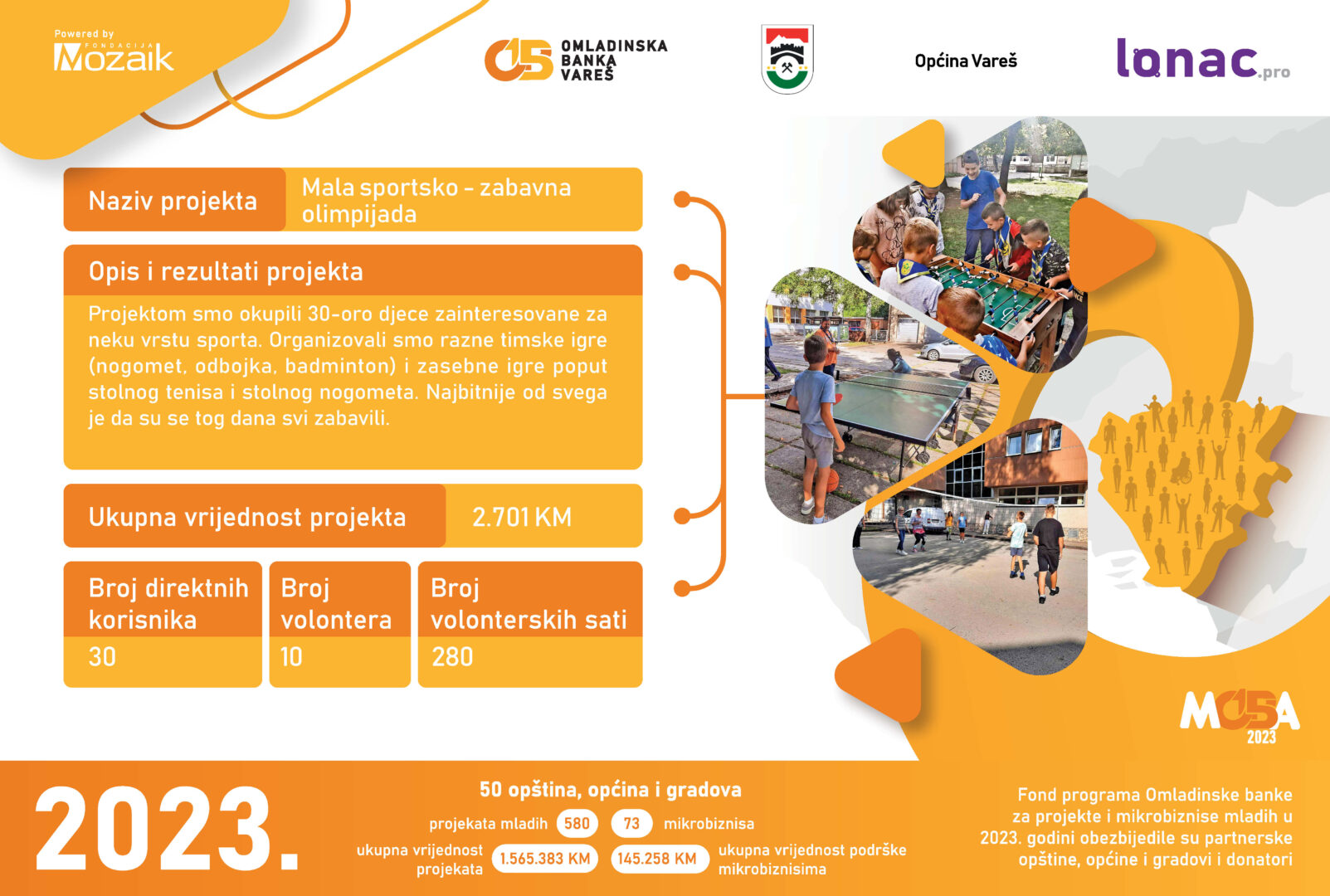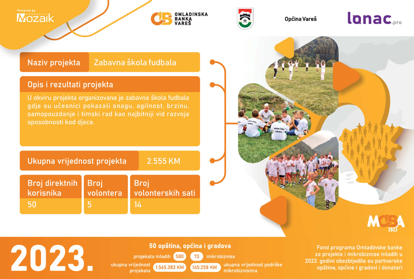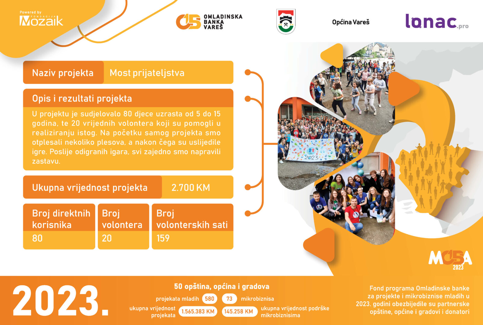 Tokom 2023. godine je realizovano 8 projekata ukupne vrijednosti 23,011 KM, od čega je Općina Gornji Vakuf-Uskoplje izdvijila 8,646 KM, a Fondacija Mozaik 5,764 KM. Doprinos zajednice u vidu robe, novca ili usluga za realizaciju 8 projekata je iznosio 8,600 KM.