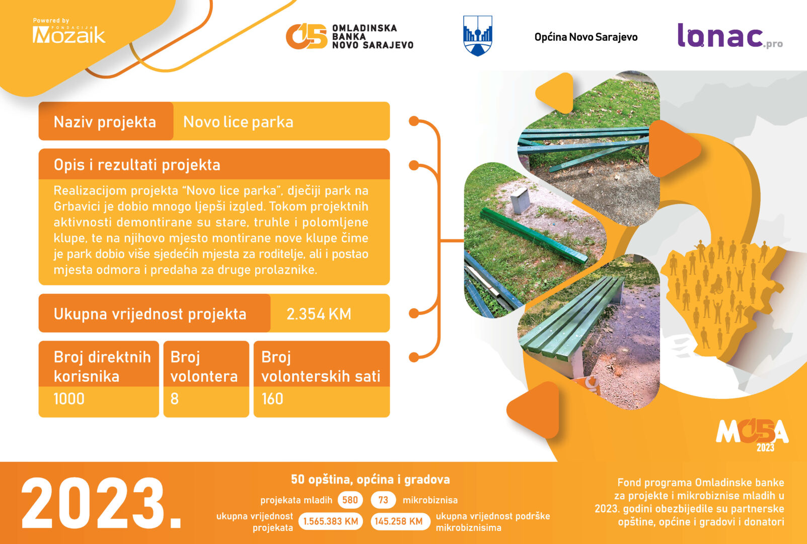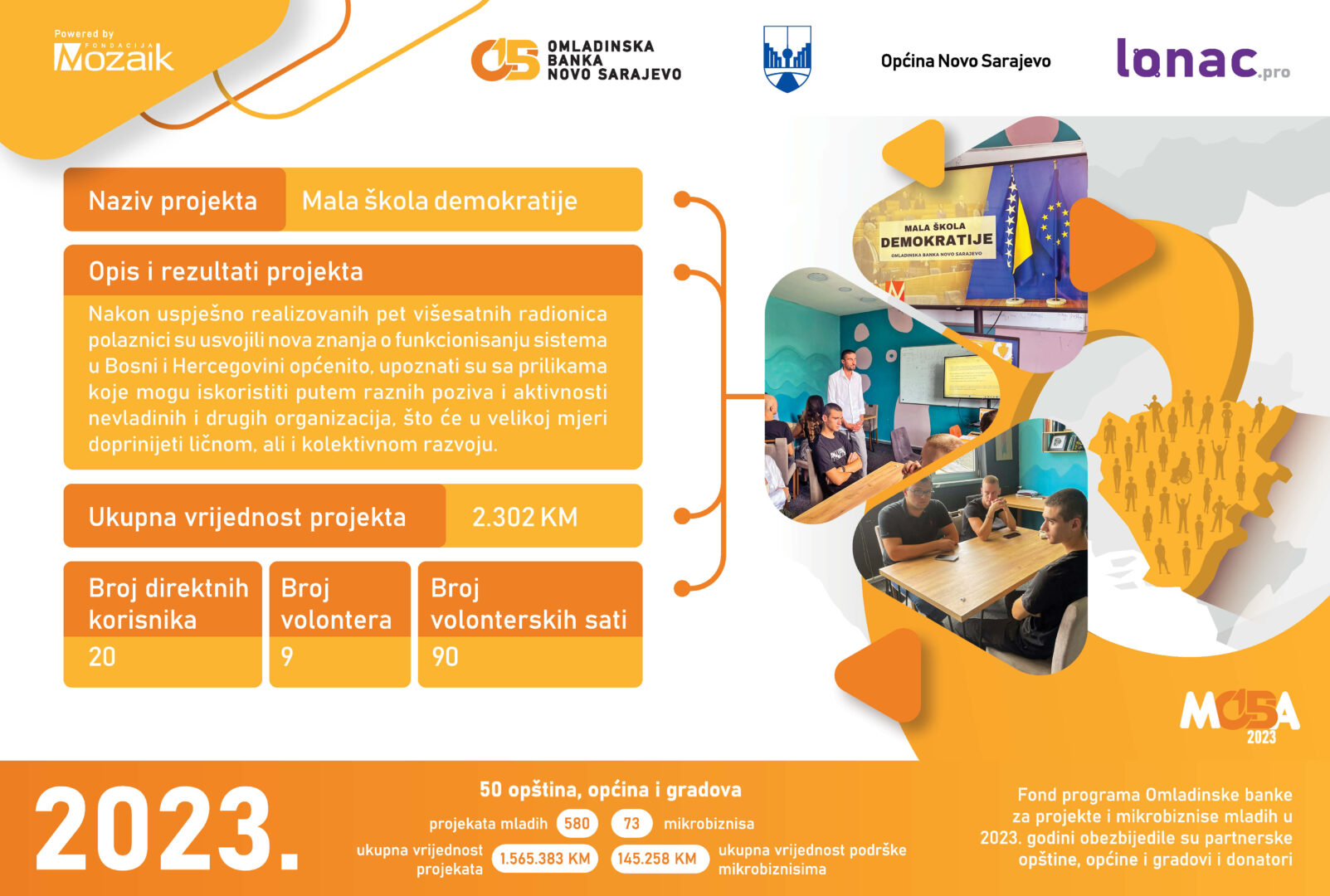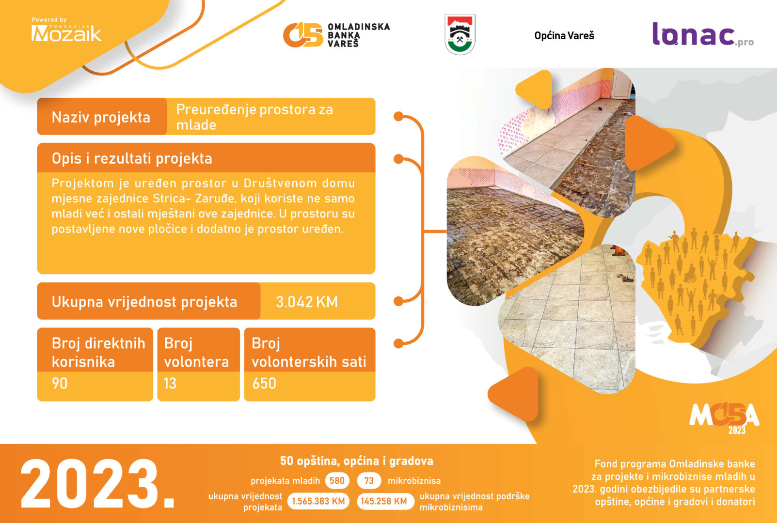 Ukupni novčani fond za realizaciju pomenutih projekata iznosi 24.320 KM, od kojeg je Omladinska banka Lopare obezbijedila 15.900 KM, a mladi kroz doprinos zajednice ukupno 8.420 KM. Svečanoj ceremoniji prisustvovali su predstavnici Fondacije Mozaik, predstavnici Opštine Lopare, članice i članovi Odbora OB Lopare i članice i članovi neformalnih grupa, kao i mediji.