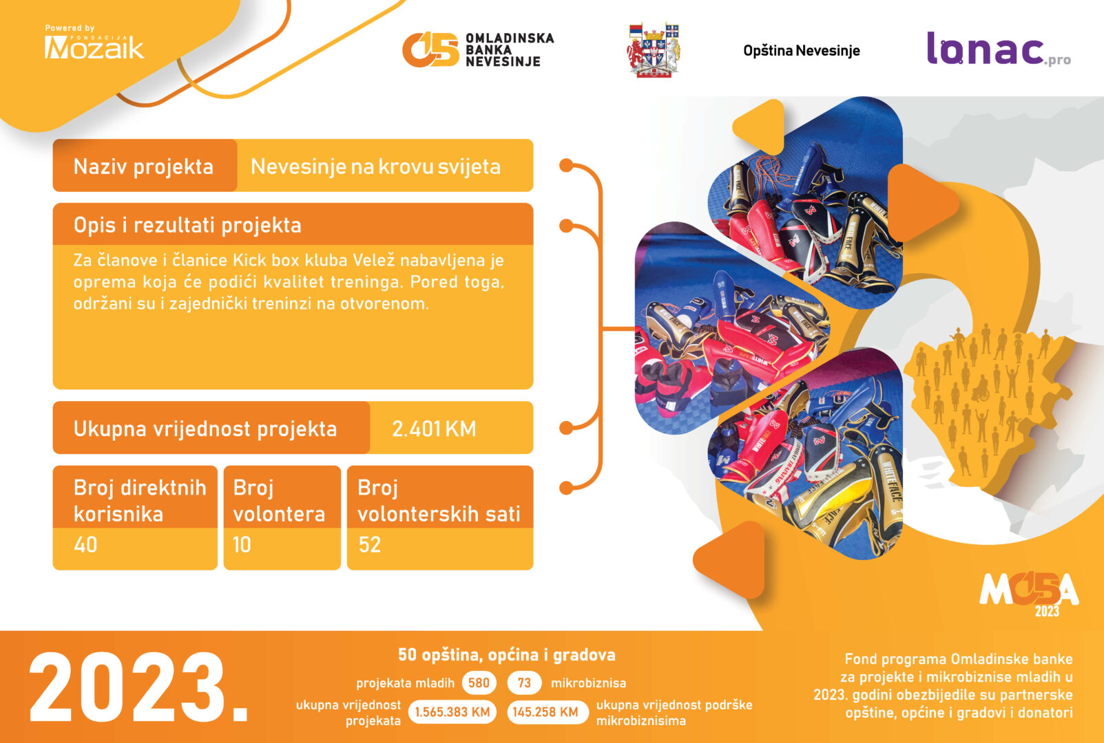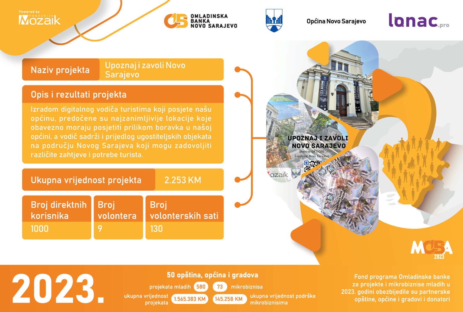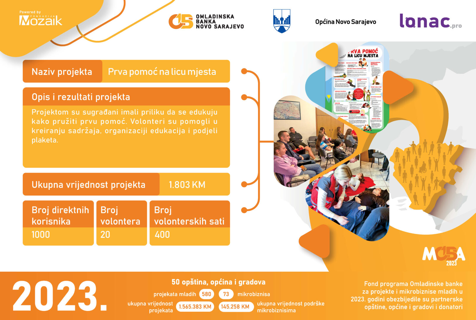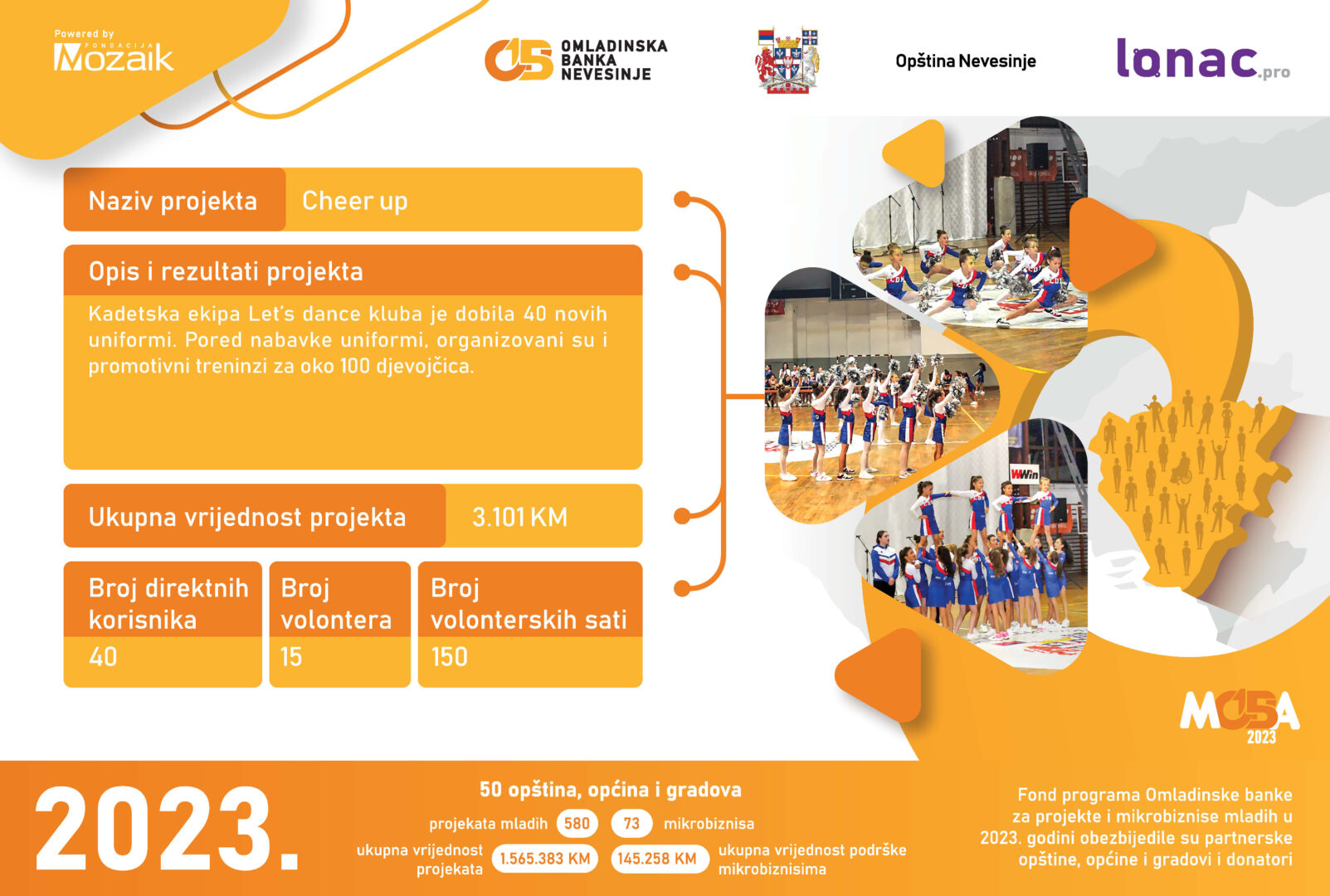 Ukupni novčani fond za realizaciju pomenutih projekata iznosi 24.320 KM, od kojeg je Omladinska banka Lopare obezbijedila 15.900 KM, a mladi kroz doprinos zajednice ukupno 8.420 KM. Svečanoj ceremoniji prisustvovali su predstavnici Fondacije Mozaik, predstavnici Opštine Lopare, članice i članovi Odbora OB Lopare i članice i članovi neformalnih grupa, kao i mediji.