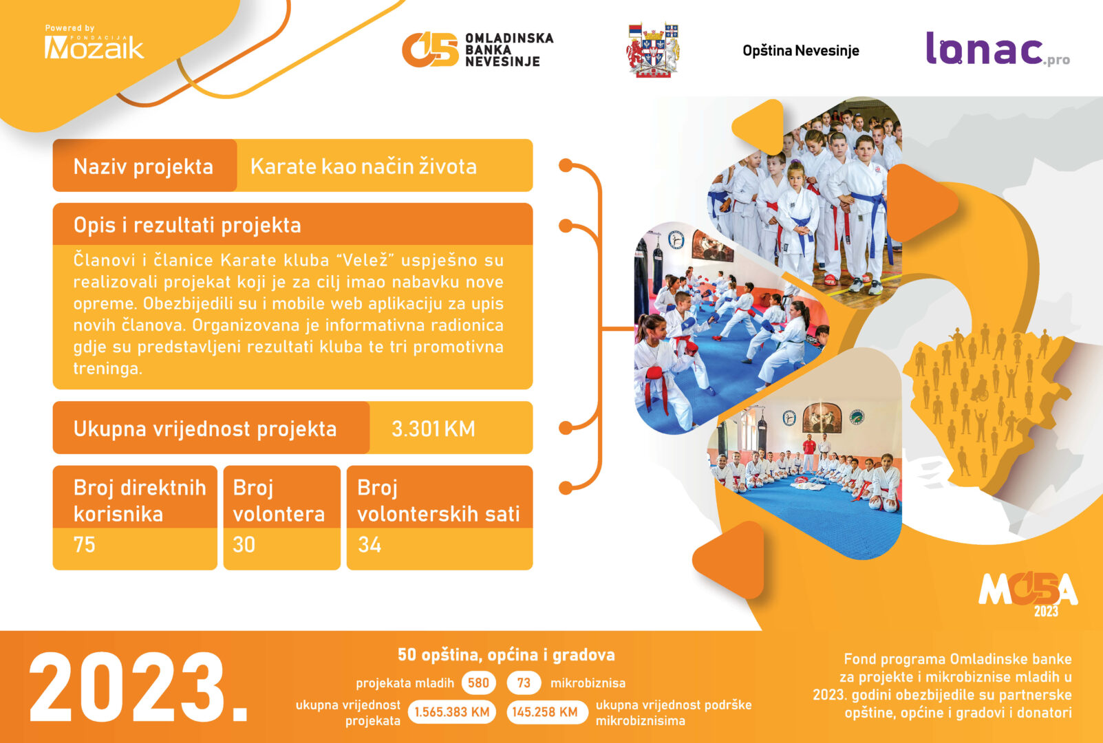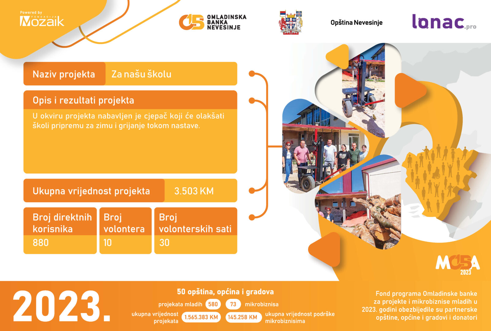 Ponosni smo na 2023. godinu jer je odobreno i realizovano 5 projekata. Ukupna vrijednost projekata iznosi 13,904 KM, gdje je učešće Opštine Nevesinje 5,162 KM, a Fondacije Mozaik 3,442 KM. U podršci ovih projekata učestvovala je i zajednica (u robu, novci i uslugama) u iznosu od 5,300 KM.