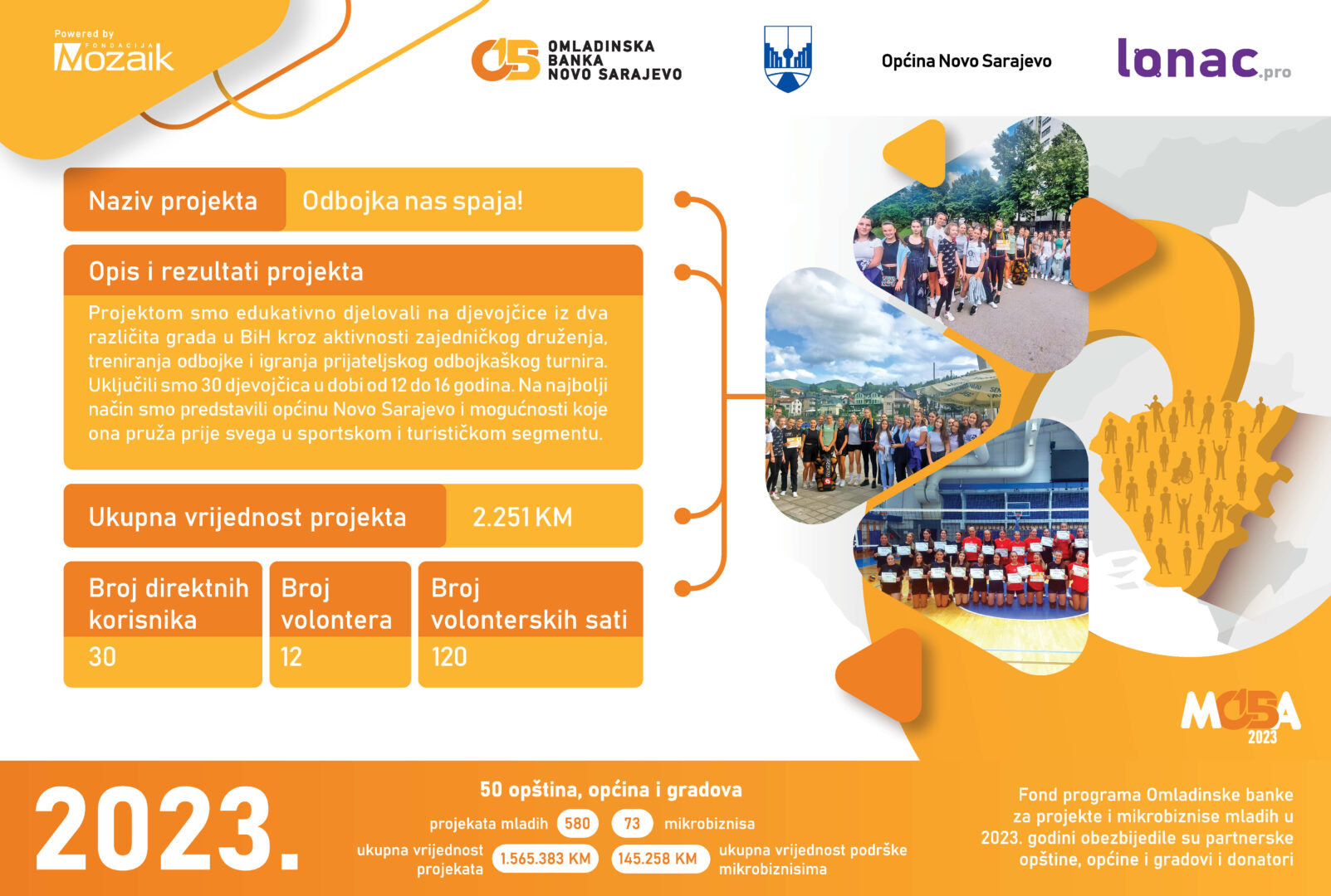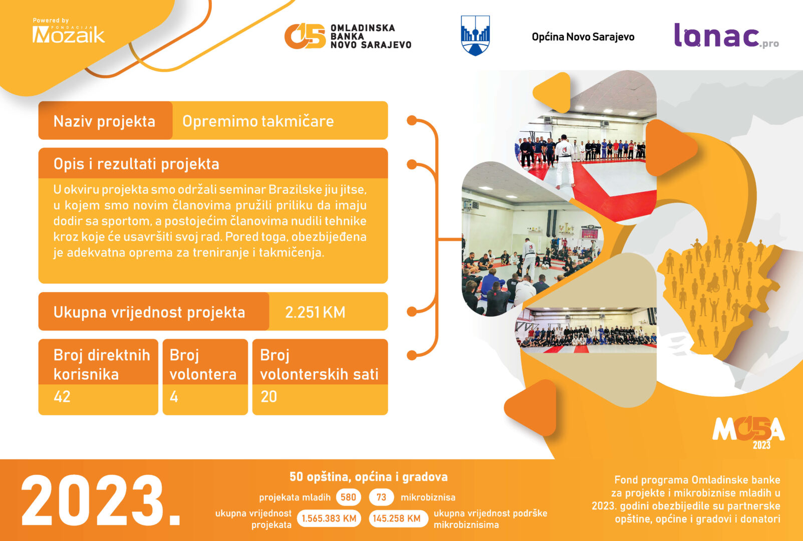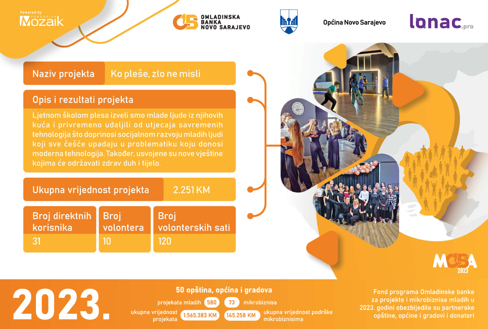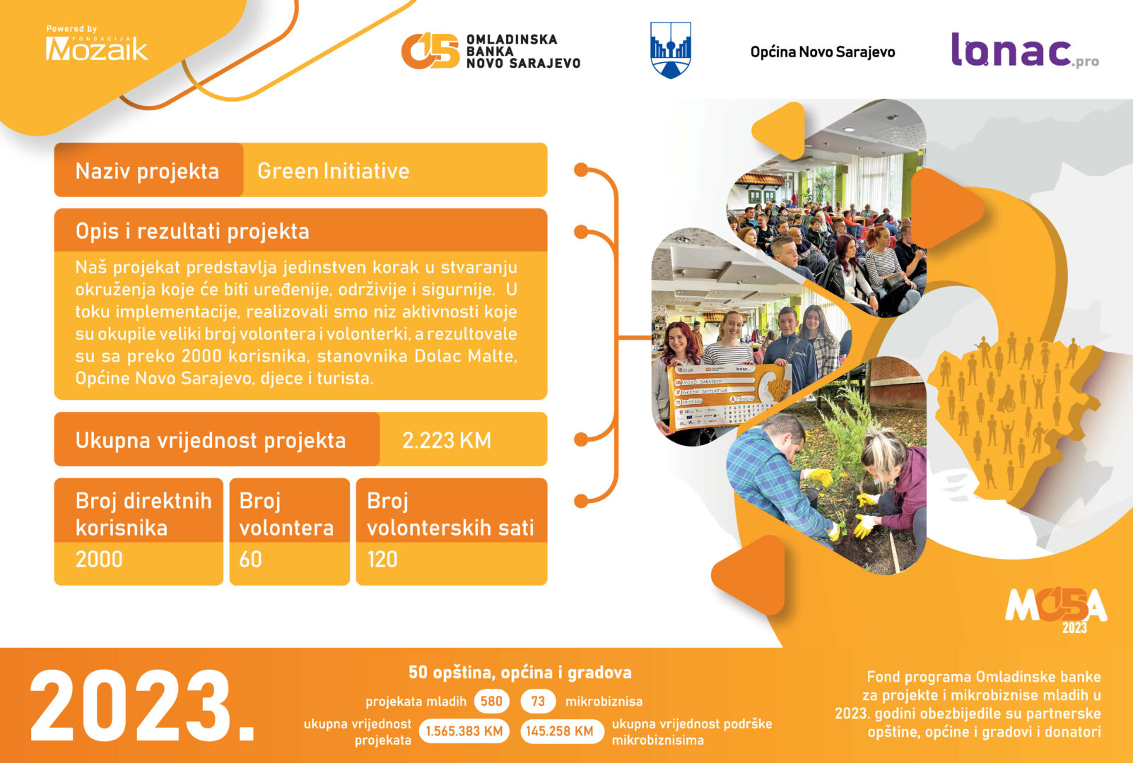 U 2023. godini je realizovano 12 projekata i registrovana su 2 mikrobiznisa. Ukupna vrijednost 12 realizovanih projekata iznosi 32,959 KM, od čega je Fondacija Mozaik izdvojila 9,353 KM, a Općina Kladanj 11,775 KM. Doprinos zajednice je iznosio 11,830 KM.