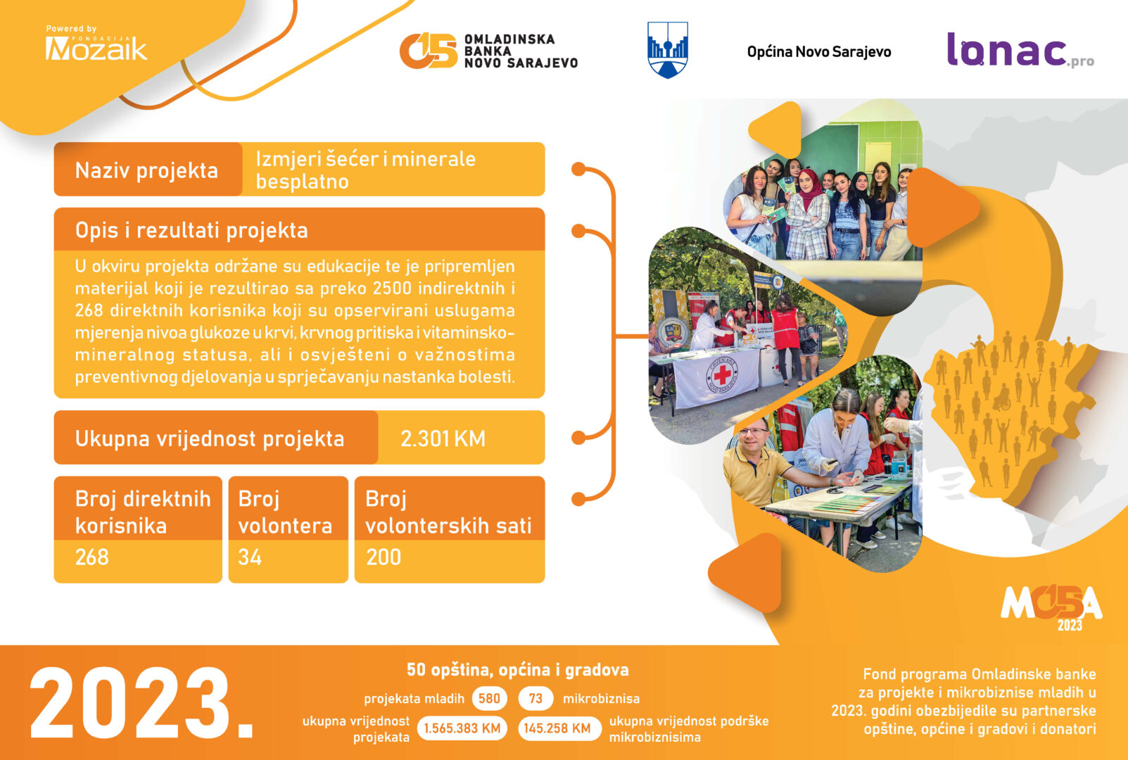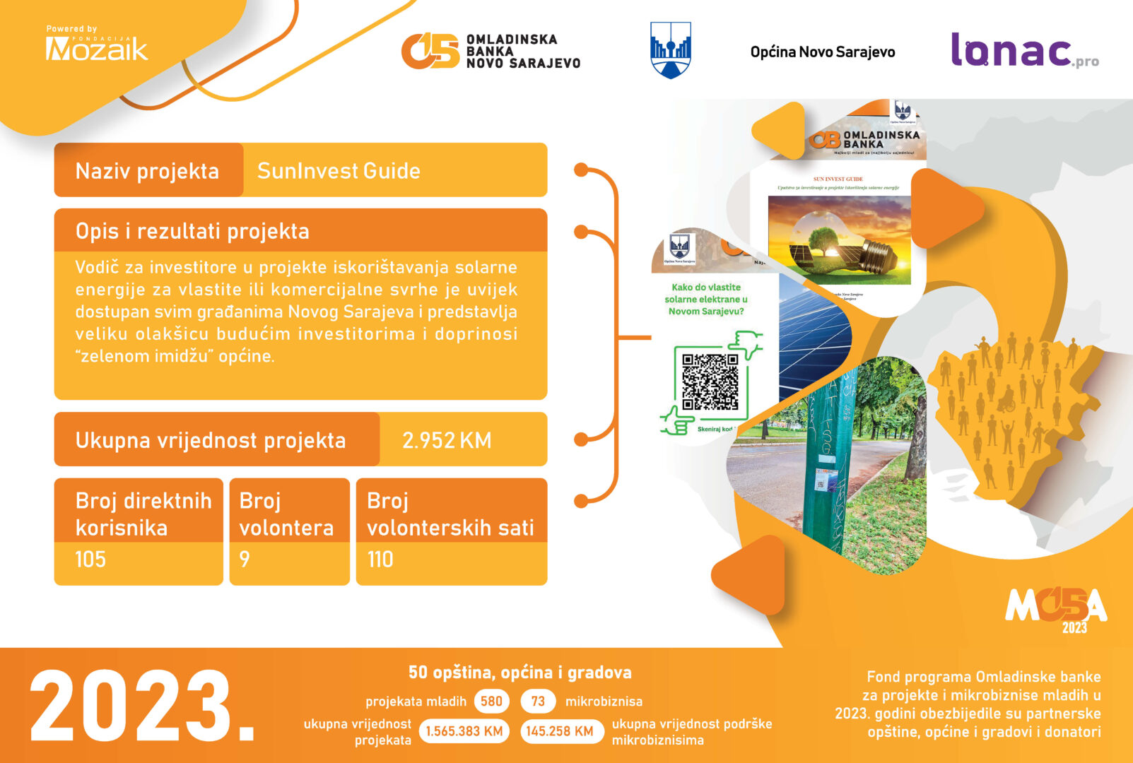 Među podržanim projektima ističu se inicijative poput “Izmjeri šećer i minerale besplatno”, “Excel radionica”, “Green Buildings”, “Green Initiative”, “Ljetno kino Lola 2”, “Novo lice parka”, “ReverseING” i “SunInvest Guide”, Odbojka nas spaja!, Biznis akademija, Opremimo takmičare, Upoznaj i zavoli Novo Sarajevo, Mala škola demokratije, Ko pleše, zlo ne misli i Prva pomoć na licu mjesta. Svaki od ovih projekata nosi sa sobom priču o angažmanu mladih u stvaranju održivije i prosperitetnije budućnosti za Novo Sarajevo.
