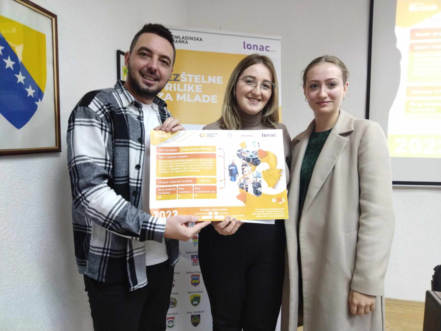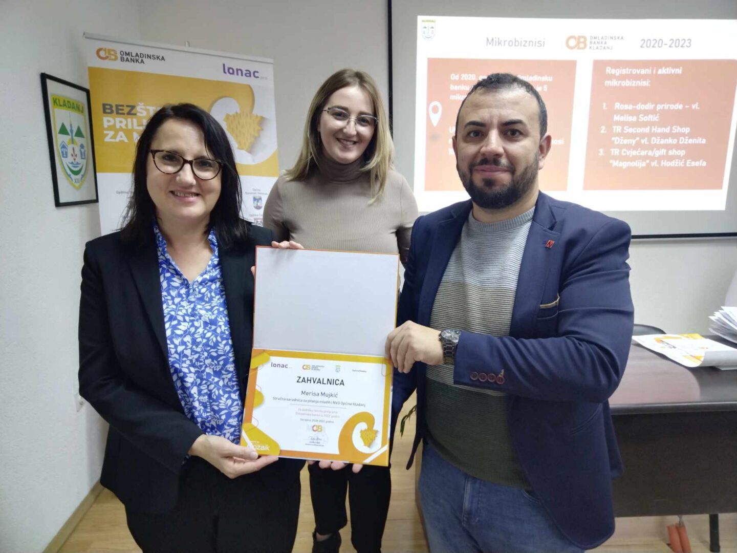 Završnoj ceremoniji dodjele zahvalnica, 01. decembra 2023. godine, prisustvovali su predstavnici Općine Kladanj, predstavnici Fondacije Mozaik, članice i članovi Odbora Omladinske banke Kladanj, kao i timovi realizovanih projekata i preduzetnice.