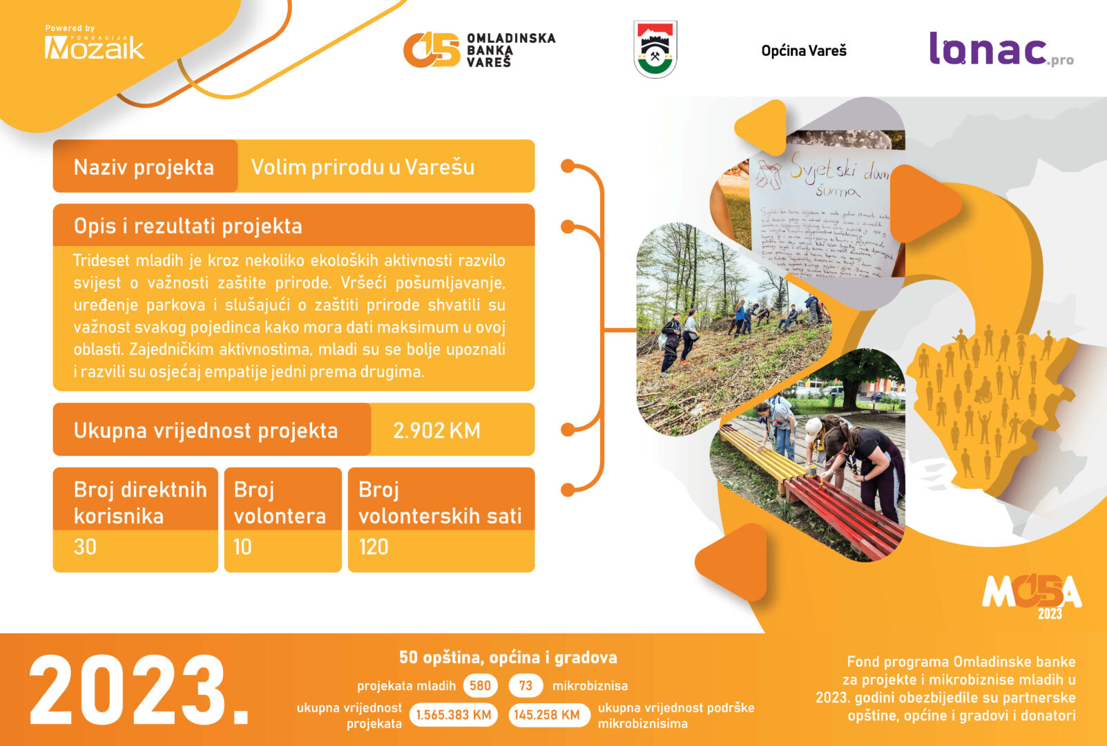S ponosom se ističu projekti koji su podržani kroz ovaj program, čiji je glavni cilj bio poticanje aktivnog sudjelovanja mladih u zajednici i podrška njihovim idejama. Među njima su “Volim prirodu u Varešu”, “Zabavna škola fudbala”, “Most prijateljstva”, “Škola muzike u prirodi”, “Čuvajmo Bobovac od zaborava”, “Mala sportsko-zabavna olimpijada”, “Izletište Obla glava” te “Preuređenje prostora za mlade”. Svaki od ovih projekata nosi sa sobom priču o entuzijazmu, trudu i želji mladih da doprinesu svojoj zajednici na najbolji mogući način.