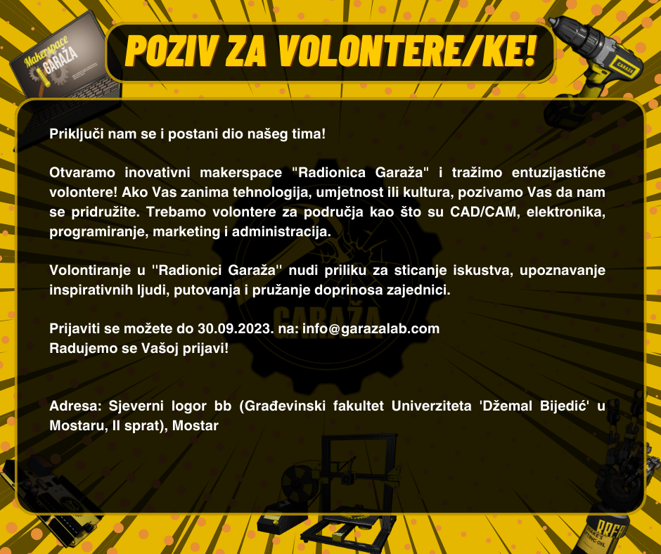 Za dodatne informacije molimo kontaktiraj tim ‘’Radionice Garaža’’ slanjem maila na info@garazalab.com ili pozivom na broj 063-515-889.