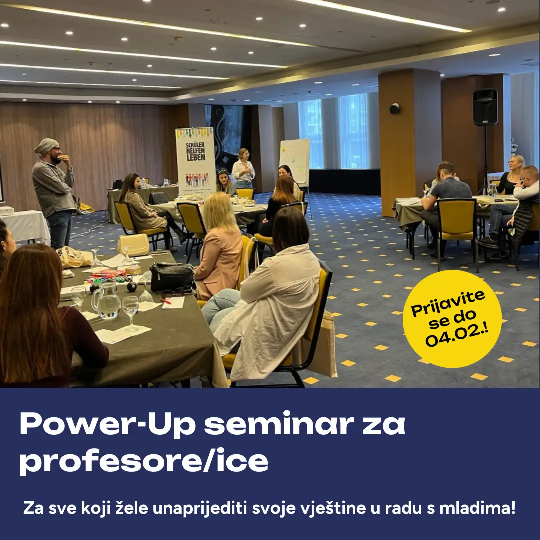 Fondacija Schüler Helfen Leben i ove godine organizuje Power Up Seminar za profesore ili profesorice i stručne saradnike ili saradnice. Seminar je namijenjen profesorima ili profesoricama i stručnim saradnicima ili saradnicama koji direktno rade sa Vijećima ili Savjetima učenika u nekoj od srednjih škola u Bosni i Hercegovini.
