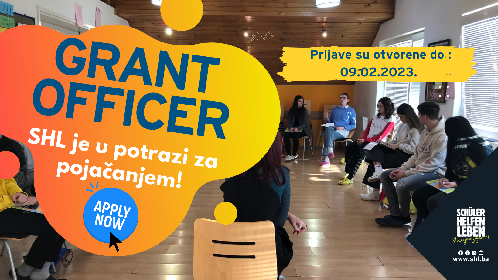 # Imaš između 18 i 23 godine? # Govoriš njemački ili engleski jezik? # Želiš provesti godinu dana u Njemačkoj? # Znaš napisati CV i motivaciono pismo? Odlično! Prijavi se za jednogodišnje volontiranje u uredima Fondacije Schüler Helfen Leben-a.