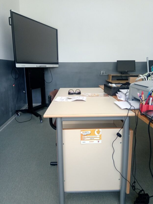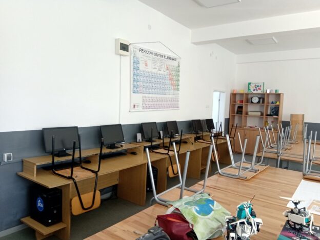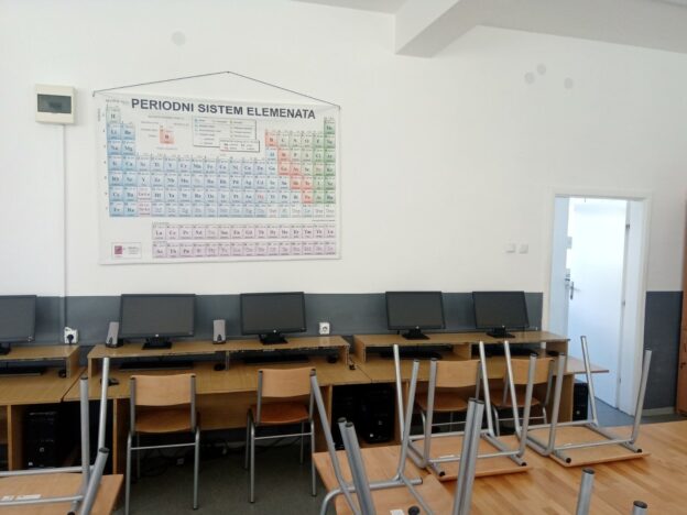 Postavljanje opreme je pravo zadovoljstvo. Sve se radilo po davno utvrđenom dogovoru. Krenulo se od glavnog stola (“katedre”). Zapravo to je obični školski sto koji je služio kao katedra, a sad je tu pravi sto za te namjene. Stare stolice su probrane, one bolje su ostavljene jer smo i dalje u manjku sa stolicama. Na prazna mjesta su postavljene nove stolice. Ženski dio tima je odlično odradio posao ako napomenemo da se boja stola i stolica trebala podudarati sa onima koje imamo u učionici. Taj dio je vidljiv i ne može a da se ne primjeti osvježenje koje smo unijeli samom postavkom tog dijela opreme. U instalaciji opreme, 31.7.2023. godine učestvovali su učenici: Milica Rudić, Darko Kojić, Lazar Arsenić, Milan Bušin i Luka Grabež.
