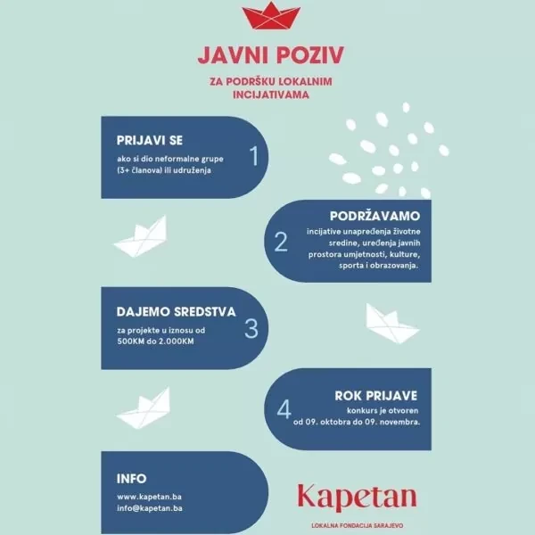 Na poziv mogu se prijaviti udruženja građana i neformalne grupe iz Sarajeva, a ideja Lokalne fondacije Sarajevo Kapetan jeste da povežu ljude različitih interesovanja i profesija, omoguće građanima i građankama Sarajeva prostor za aktivno udruživanje i obezbijede podršku za rješavanje problema u lokalnoj zajednici koje građani/ke ne mogu samostalno da riješe.