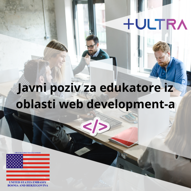 Udruženje za razvoj i podršku mladih Plus Ultra raspisuje Javni poziv za edukatore i edukatorice iz oblasti web development-a. U toku 2023. godine radimo na implementaciji projekta “Empowering future workforce and leaders of IT industry in BiH” koji uključuje organizaciju edukacija iz web development-a za studente i studentice. U potrazi smo za stručnim edukatorima i edukatoricama koji imaju iskustvo i znaju kako prenijeti svoje znanje drugima.