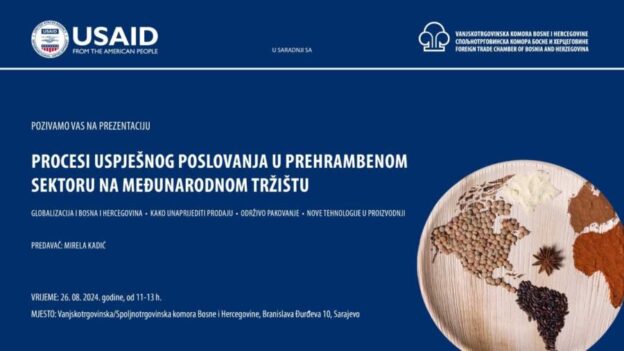 U sklopu USAID projekta “Diaspora Invest” koji se realizira u saradnji s Vanjskotrgovinskom/ Spoljnotrgovinskom komorom Bosne i Hercegovine, Privrednom komorom Republike Srpske i Privrednom/Gospodarskom komorom Federacije Bosne i Hercegovine, a kojem je cilj povezivanje bh. kompanija s međunarodnim tržištem putem posrednika iz dijaspore, biće održana prezentacija “Procesi uspješnog poslovanja u prehrambenom sektoru na međunarodnom tržištu”.