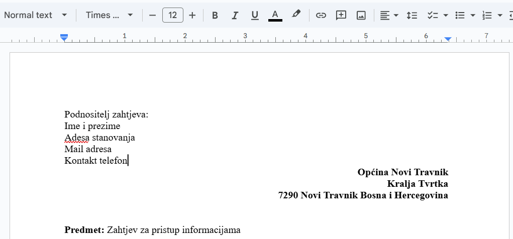 “U skladu sa važećim Zakonom o slobodi pristupa informacijama bh. entiteta FBiH, usklađenim sa državnim zakonom, molim da mi, na navedenu adresu poštom, u zakonskom roku od 15 dana od dana prijema ovog zahtjeva, dostavite sljedeće:”