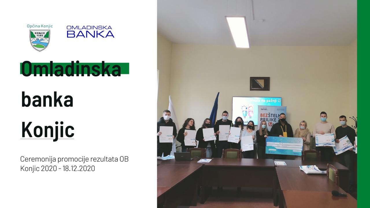U petak, 18.decembra u prostorijama općine Konjic održana je ceremonija promocije rezultata za Omladinsku banku Konjic u 2020.godini. Ceremoniji su prisustvovali: Biljana Handžo – predstavnica Općine za program Omladinske banke, Mediha Arnaut i Natalija Vidaković – predstavnice Fondacije Mozaik, te članovi i članice odbora kao i neformalnih projektnih grupa.