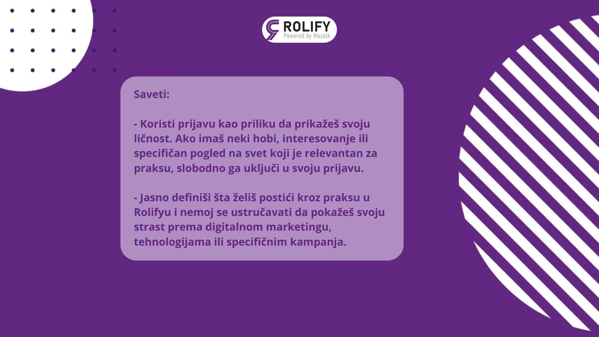 Na kraju, jako je važno da u svojoj prijavi prikažeš i svoju autentičnost i motivisanost. Pokaži ko si, šta te motiviše i zašto baš želiš praksu u Rolifyu. U okruženju kao što je Rolify, gde se ceni timski rad i iskrena komunikacija, biti svoj je ključno za izgradnju poverenja i uspešnu saradnju. Nismo u potrazi za savršenstvom, već za ljudima koji žele da rastu i razvijaju se zajedno sa nama, tako da nema potrebe da ulepšavaš ili preuveličavaš svoje kvalitete.