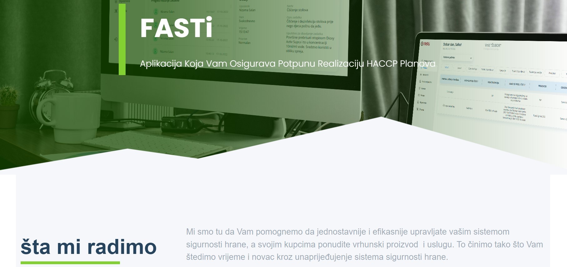 „Od same ideje do završetka prve verzije proizvoda prošlo je nešto manje od dvije godine. Trenutno imamo razvijenu aplikaciju FASTi, koja subjektima u poslovanju sa hranom omogućava jednostavnije i efikasnije upravljanje sistemom sigurnosti hrane. Digitalizacijom omogućavamo menadžerima da svakodnevno vrše monitoring procesa, koji vrlo često podrazumijeva i kontrolu većeg broja poslovnih jedinica koje su raspoređene po čitavom gradu ili državi, a radnicima da u svakom trenutku imaju pregled planiranih aktivnosti, koje na osnovu toga mogu obaviti pravovremeno i jednostavno evidentirati obavljene zadatke“, rekao mi je Salko i napomenuo da „svi subjekti u poslovanju sa hranom su prema Zakonu o hrani BiH, obavezni da uspostave, provode i održavaju stalni postupak nadzora koji se temelji na principima HACCP-a“.