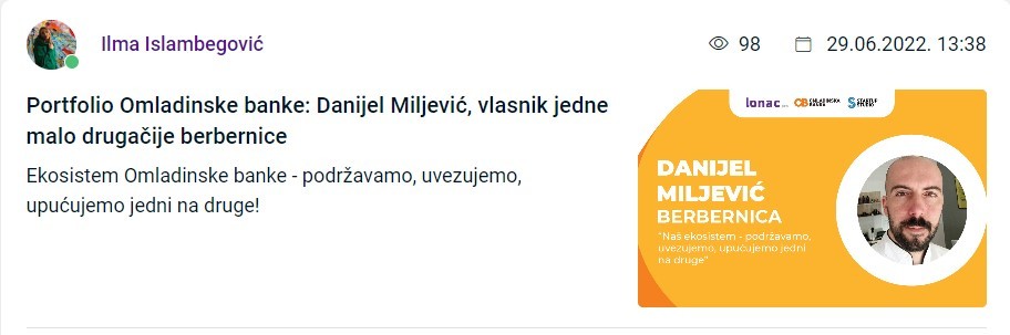 ⚬ Ispričali smo priču Danijela Miljevića, mladog preduzetnika i vlasnika jedne malo drugačije berbernice koji je uz pomoć Omladinske banke započeo svoj biznis, a kasnije ga i dodatno unaprijedio.