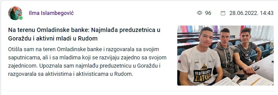⚬ Mladi iz Omladinske banke pisali su nam kako razvijaju svoje zajednice u Odžaku, Kladnju, Usori, Cazinu, Rudom, Stanarima, Zavidovićima, Prijedoru, Derventi, a stigla nam je i priča o kreativnom studiju u Šipovu koji je otvoren uz podršku Omladinske banke. Ispričali smo i priču sa terena Omladinske banke u Goraždu i Rudom gdje smo sreli najmlađu preduzetnicu i aktivne mlade koji su uzori u svojim zajednicama.